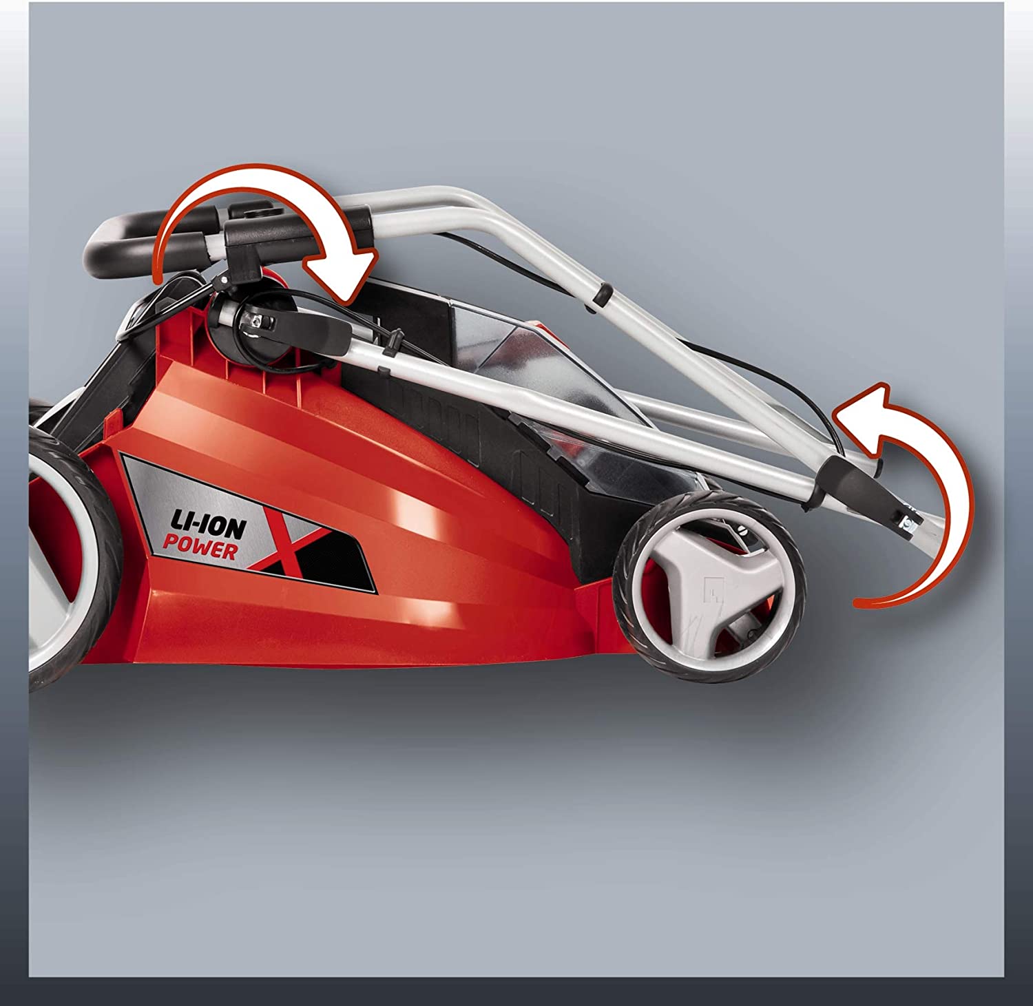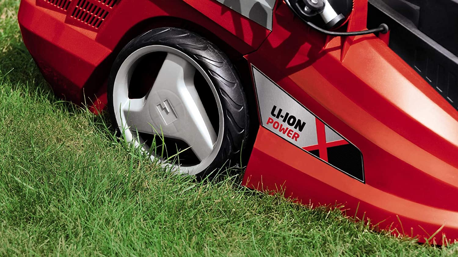 • С новата акумулаторна система Power X-Change от Einhell, косачката има две мощни 18 V батерии с 3.0 Ah за продължителна употреба без проблемите със захранващия кабел.