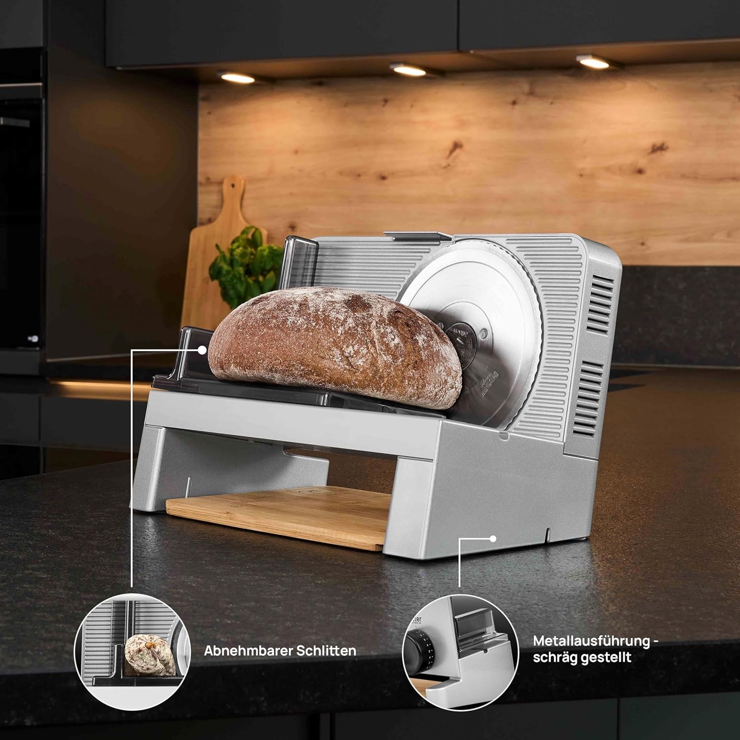 • Добре обмислена: FSC-сертифицирана бамбукова дъска, подвижна шейна за материал за рязане с приблизително 18 см разстояние за рязане, държач за остатъци, както и предпазител и безстепенно превключване правят работата в кухнята приятна.