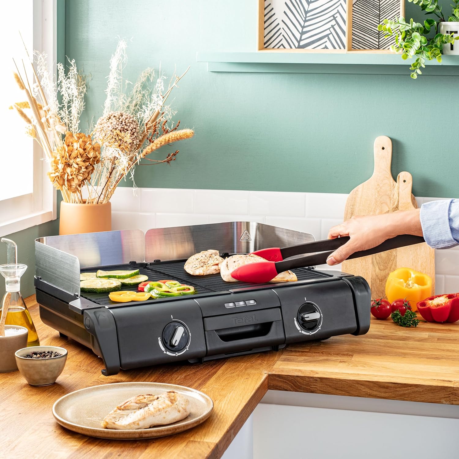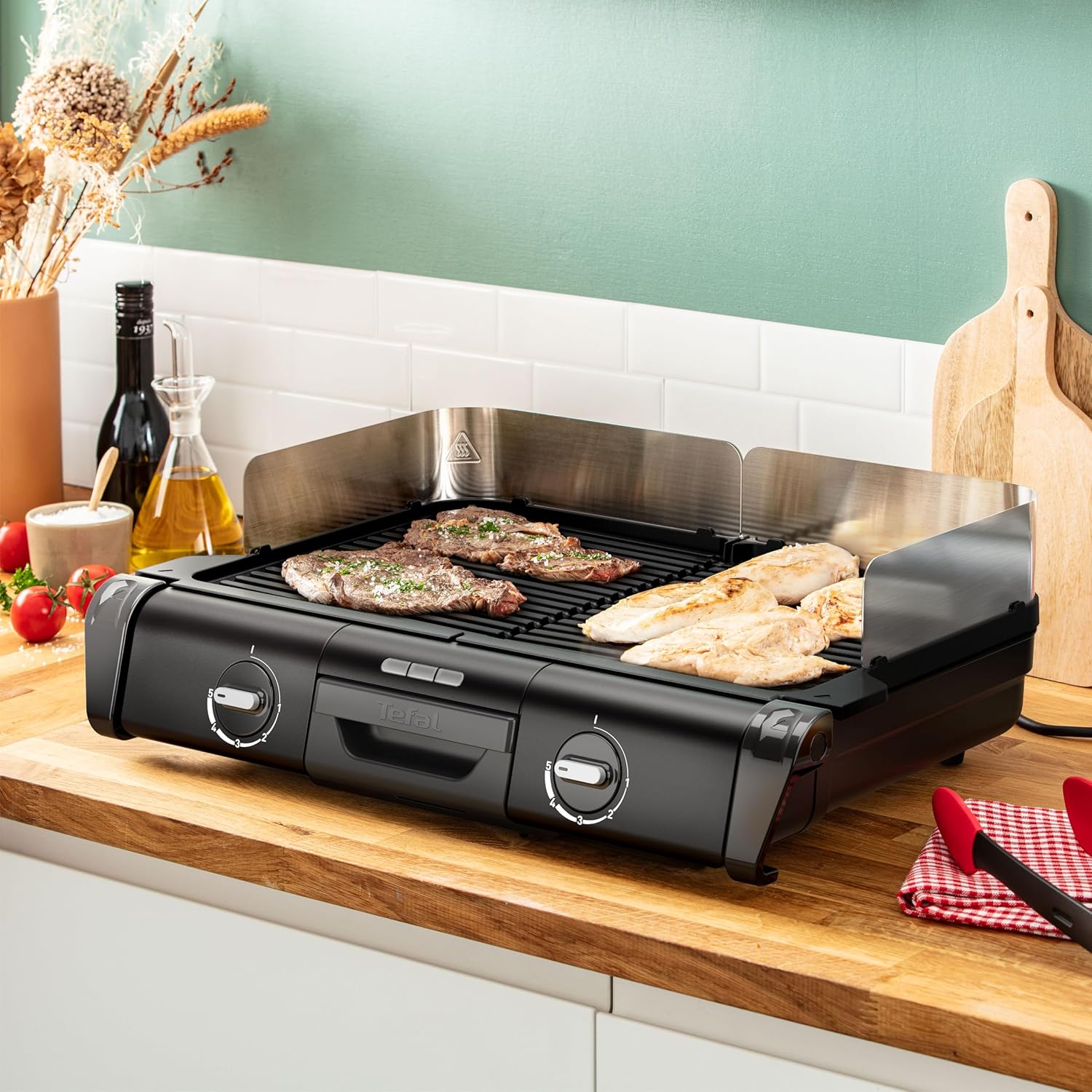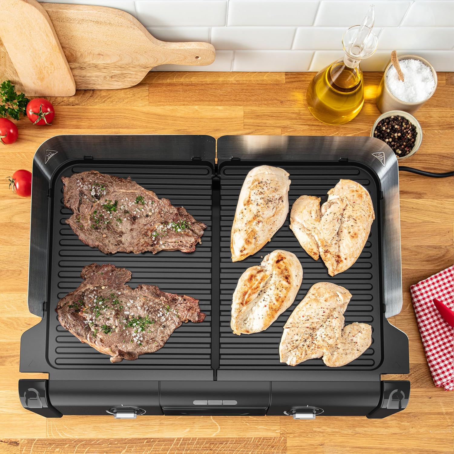 Пригответе вкусна храна на скара за цялото семейство, до 10 души! Семейният грил разполага с две независими повърхности за печене с индивидуални термостати за едновременно готвене на различни съставки. От крехко месо и ароматна риба до зеленчуци на скара, насладете се на здравословно готвене с малко или никакво олио, благодарение на незалепващите плочи и подвижната тава за отцеждане. Със семейния грил възможностите са безкрайни!