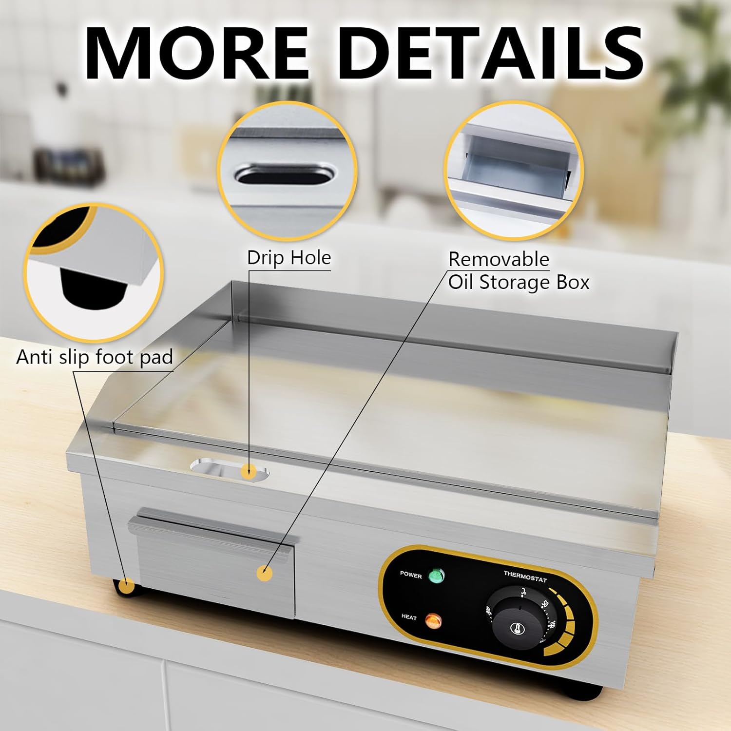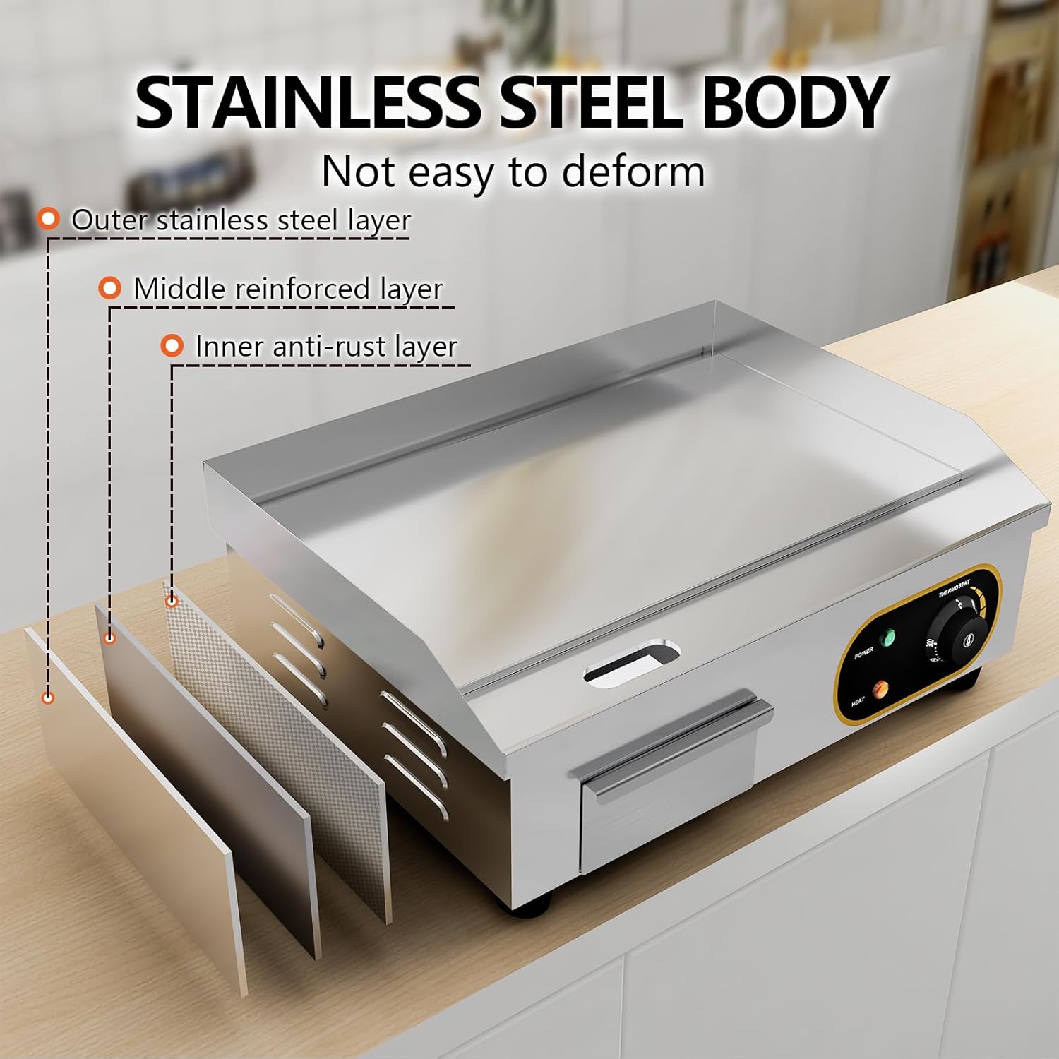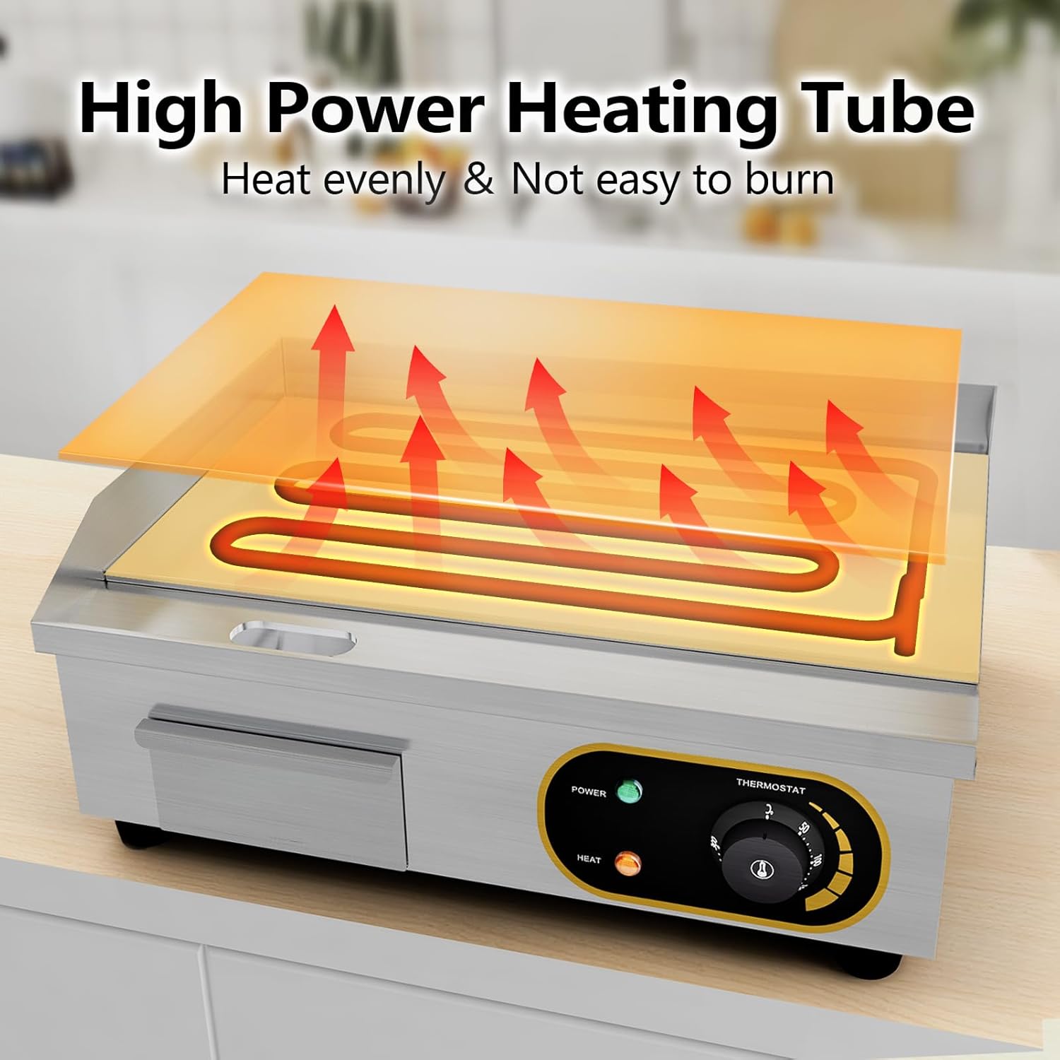 Този търговски електрически котлон е идеален за готвене на пилешко месо, риба, пържоли, печено сирене, палачинки, бъркани яйца и др. Той се използва широко в ресторанти, заведения за бързо хранене, столови и други търговски заведения.