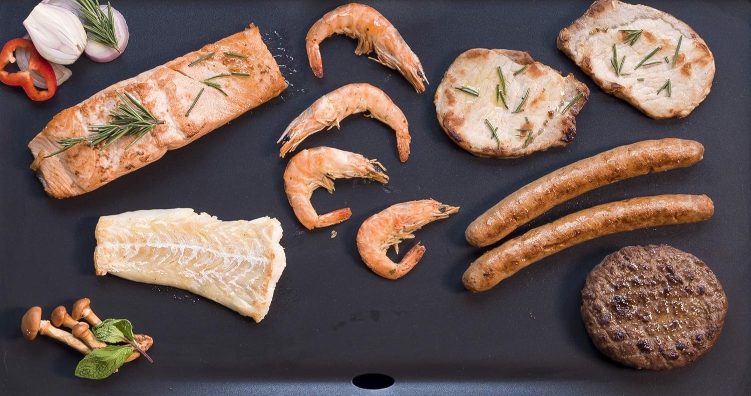 • Висококачествена повърхност с незалепващо покритие за печене на месо, колбаси, зеленчуци, картофи, яйца, палачинки и много други на скара без мазнини и олио.