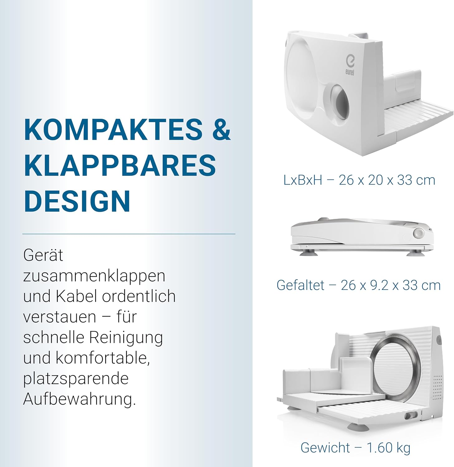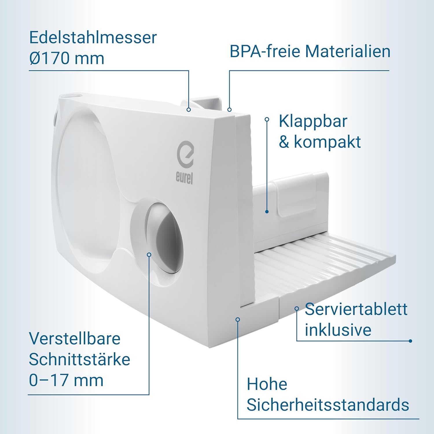 Електрическа резачка за хляб EUREL RS44, бяла, сгъваема резачка за хляб с острие от неръждаема стомана, диаметър 170 мм, тава за сервиране, дебелина на рязане 0-17 мм, без BPA, 100 W