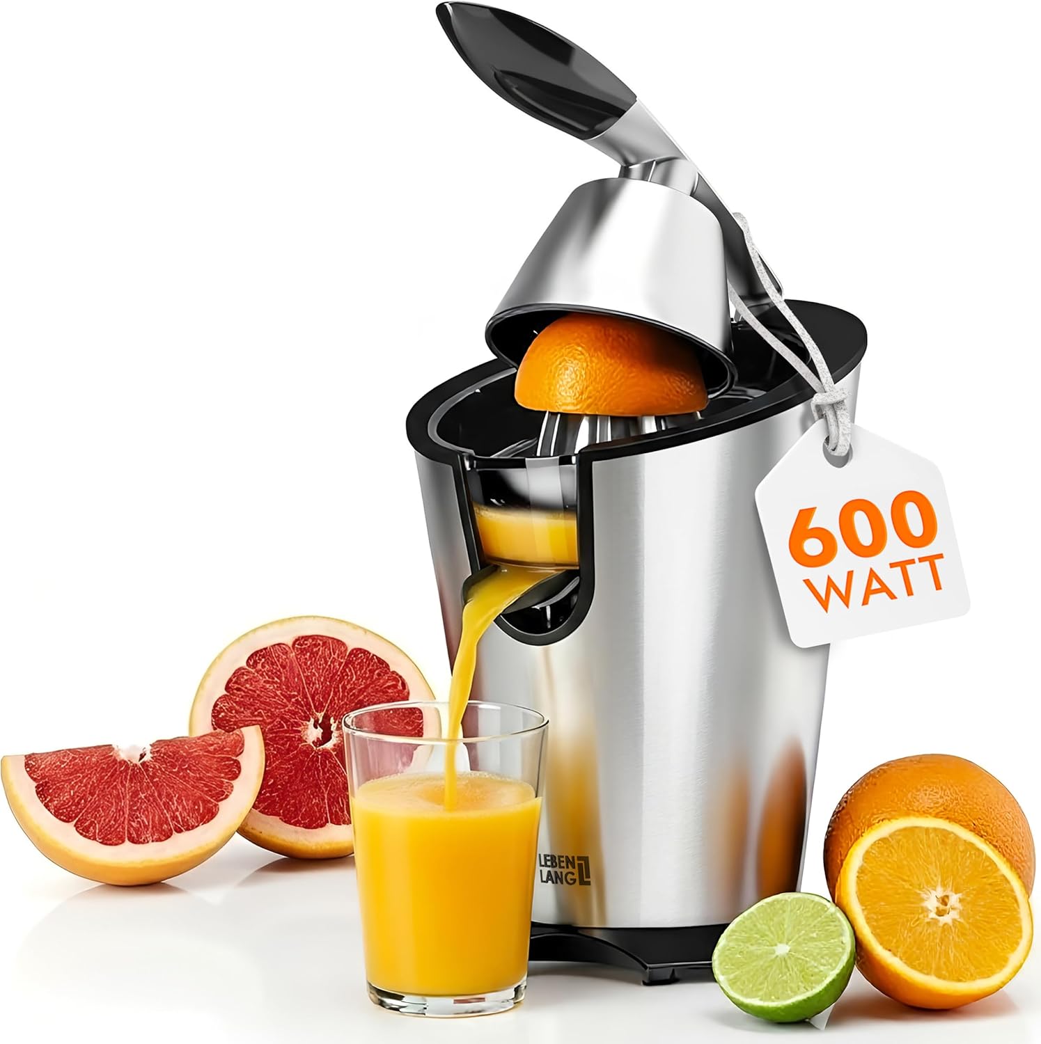 • 600 вата мощност: ДОЖИВОТНА оптимална сокоизстисквачка от неръждаема стомана благодарение на лоста и изключително мощния мотор – сокоизстисквачка за портокали/лимони от кетъринг индустрията, тиха и без BPA