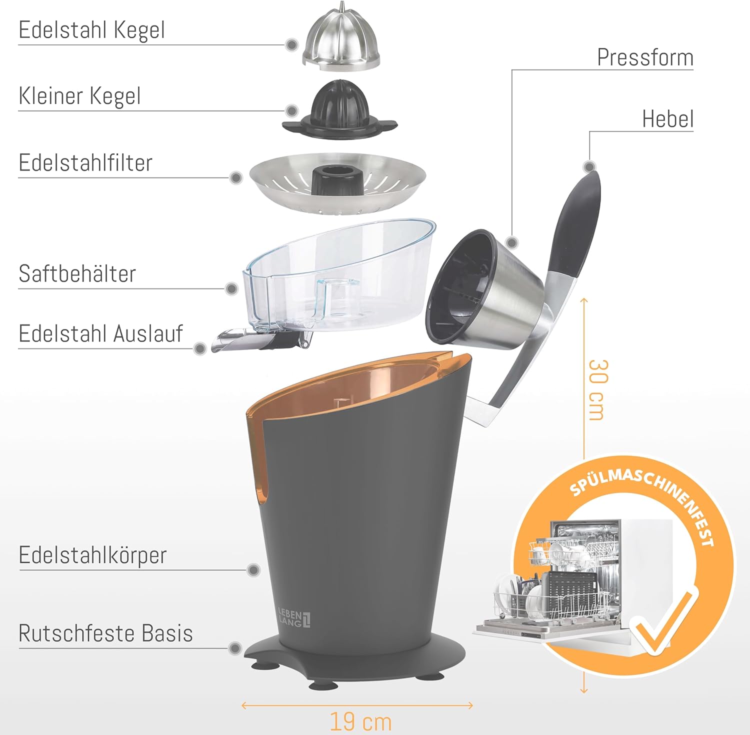 • 600 вата мощност: ДОЖИВОТНА оптимална сокоизстисквачка от неръждаема стомана благодарение на лоста и изключително мощния мотор – сокоизстисквачка за портокали/лимони от кетъринг индустрията, тиха и без BPA