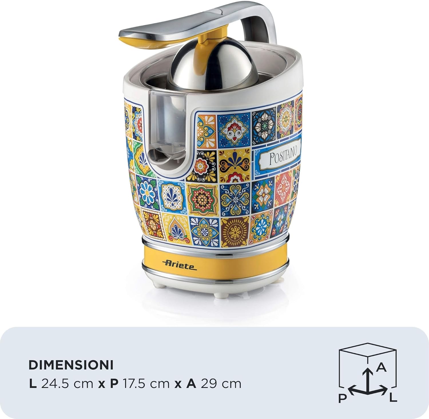 Цитрусовата сокоизстисквачка от серията Capri съчетава изискан дизайн с практична функционалност и внася средиземноморския чар на Capri директно във вашата кухня. С мощен, тих мотор, здрав метален корпус и елегантна хромирана повърхност, тя впечатлява както визуално, така и със своята ефективност. Оборудвана с два конуса от неръждаема стомана - единият голям за портокали и грейпфрути, а другият с удобен щифт за захващане за лимони и лаймове - цитрусовата сокоизстисквачка предлага максимална гъвкавост. Професионалният лост за налягане позволява лесно изцеждане, а чучурът от неръждаема стомана осигурява прецизно освобождаване на сок без разхищение. Благодарение на внимателно обмислената конструкция, работната повърхност остава чиста, а почистването е изключително лесно. Тази цитрусова сокоизстисквачка е перфектният избор за всеки, който цени стила, комфорта и професионалните резултати - независимо дали е за сутрешен витаминен шок или за освежаващи напитки междувременно.