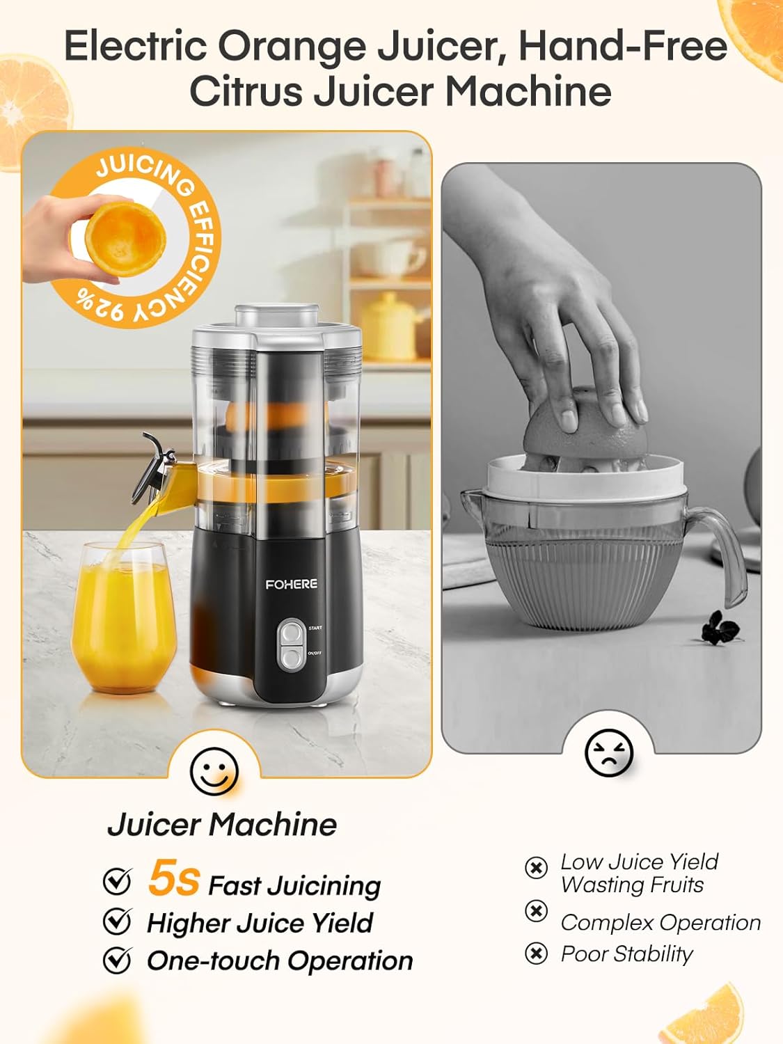 • Защо трябва да изберете сокоизстисквачката FOHERE: цитрусовата сокоизстисквачка FOHERE впечатлява с високото си качество и атрактивен дизайн. 100-ватовият мотор е толкова мощен, че приготвя чаша сок само за 40 секунди - работи тихо, без да се клатушка или преобръща. За разлика от други сокоизстисквачки, просто трябва да натиснете бутона "Старт" и машината започва да изцежда сок, оставяйки ръцете ви свободни.