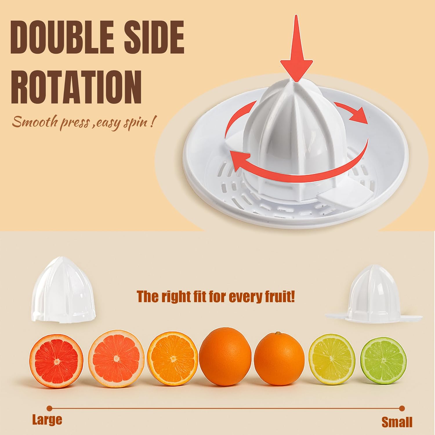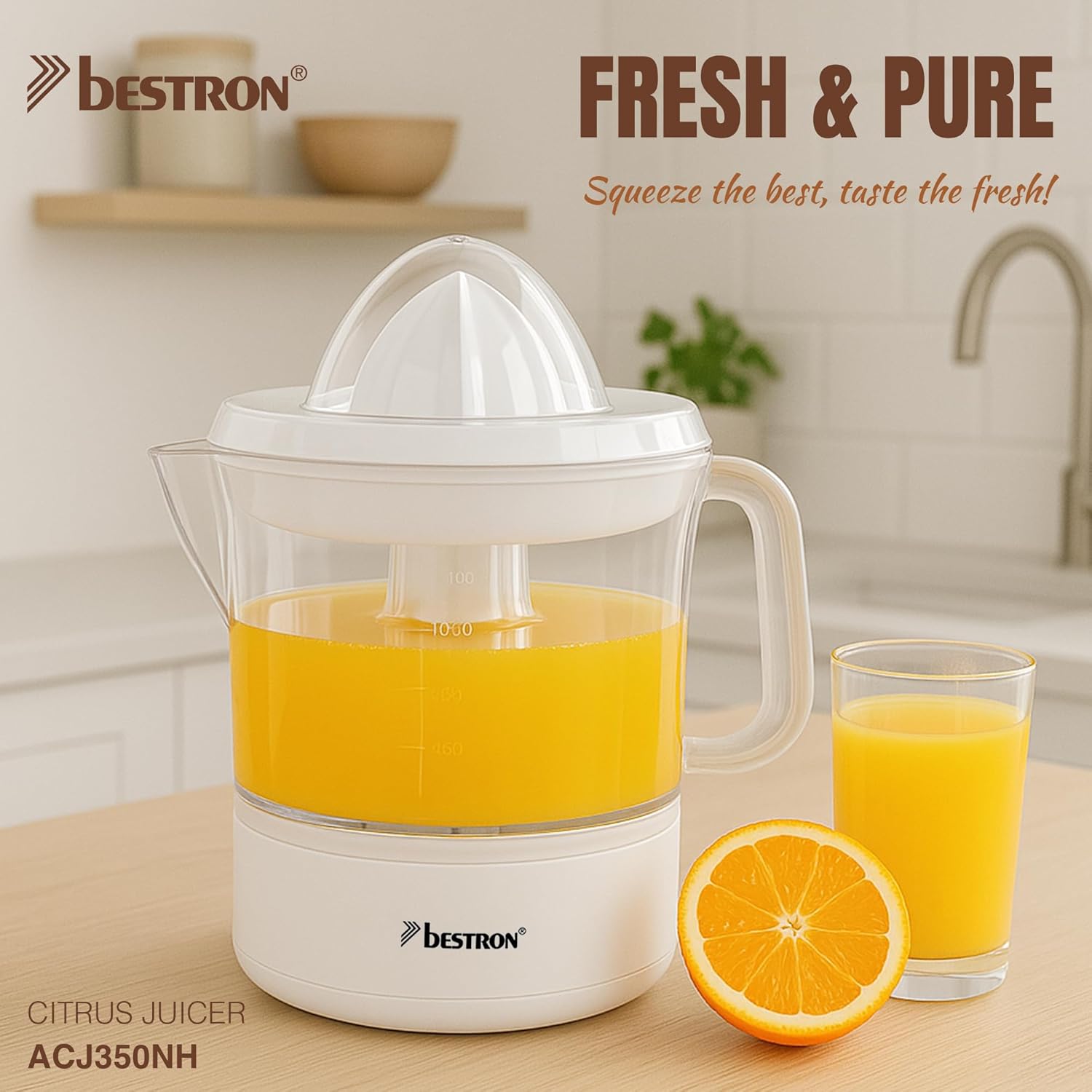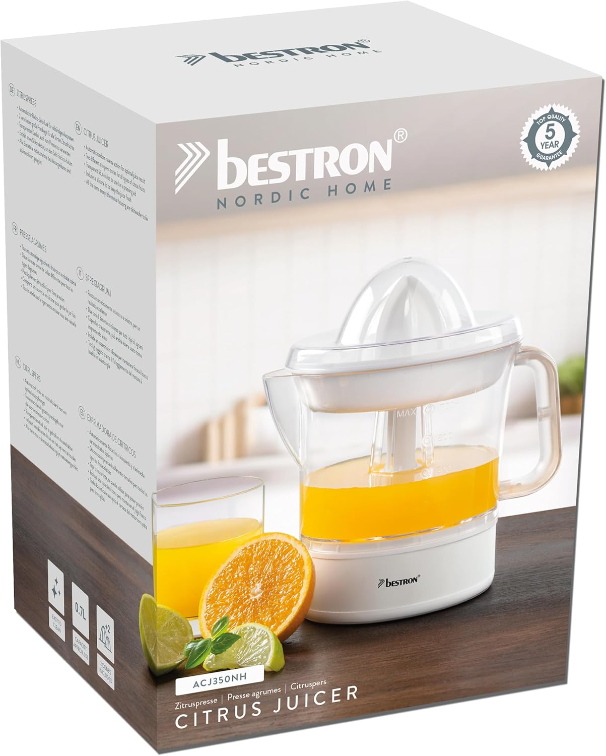 Голяма автоматична сокоизстисквачка за цитрусови плодове за бързо и прясно изцеден сок от цитрусови плодове като грейпфрути, лимони, лайм, портокали и др. 2 посоки на въртене (ляво/дясно) и 2 пресови конуса с различен размер за оптимални резултати, ароматен капак за запазване на свежия вкус. Прозрачен контейнер с дисплей за съдържание до 0,7 л, цедка за пулпа и семки за допълнителна обработка, дължина на кабела 91 см. Сигурна стойка благодарение на неплъзгащи се крачета, лесна за почистване под течаща вода, подвижни части, подходящи за съдомиялна машина (с изключение на корпуса на двигателя). Съдържание на кутията: 1 сокоизстисквачка за цитрусови плодове Bestron, 2 пресови конуса, ароматен капак, цедка, мощност: 40 W, капацитет: 0,7 л, размери: 15 x 19 x 20,5 см, тегло: 0,65 кг, материал: пластмаса/неръждаема стомана, цвят: черно/дърво, ACJ350BW