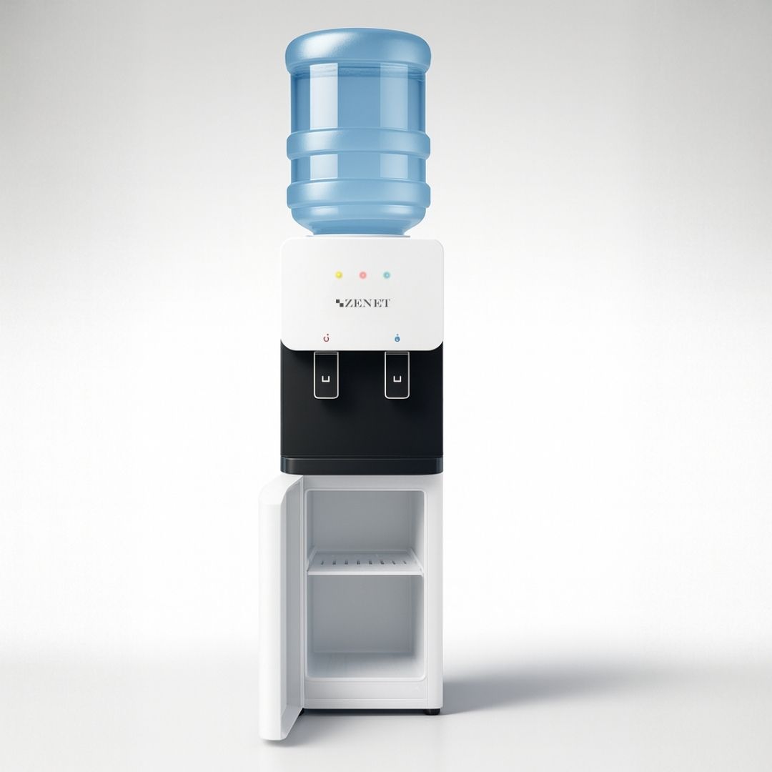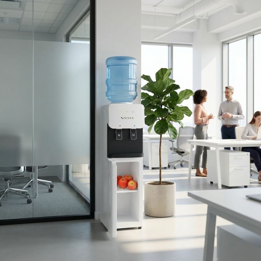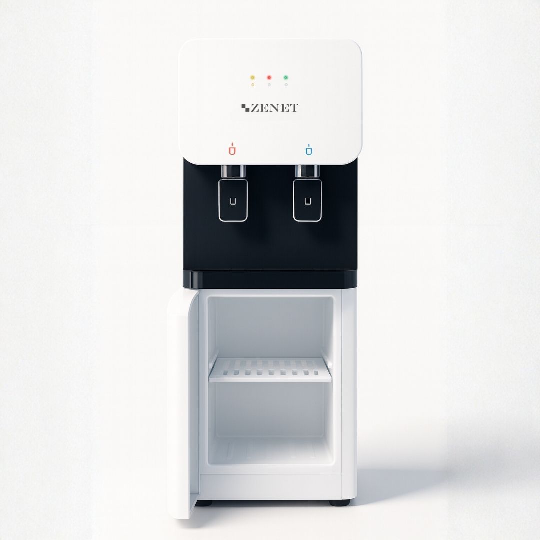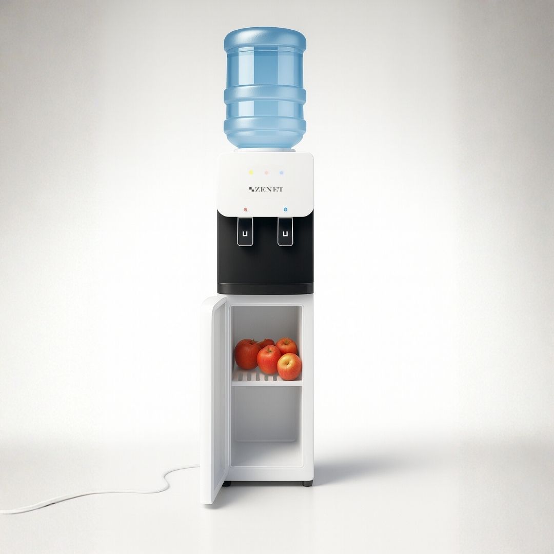 Диспенсърът за вода ZENET ZET-313 съчетава модерен дизайн, надеждна технология и практичен шкаф за съхранение на напитки или храна. Той осигурява топла, студена и стайна вода само с едно докосване – идеално решение за офиси, домове, училища, рецепции или чакални.