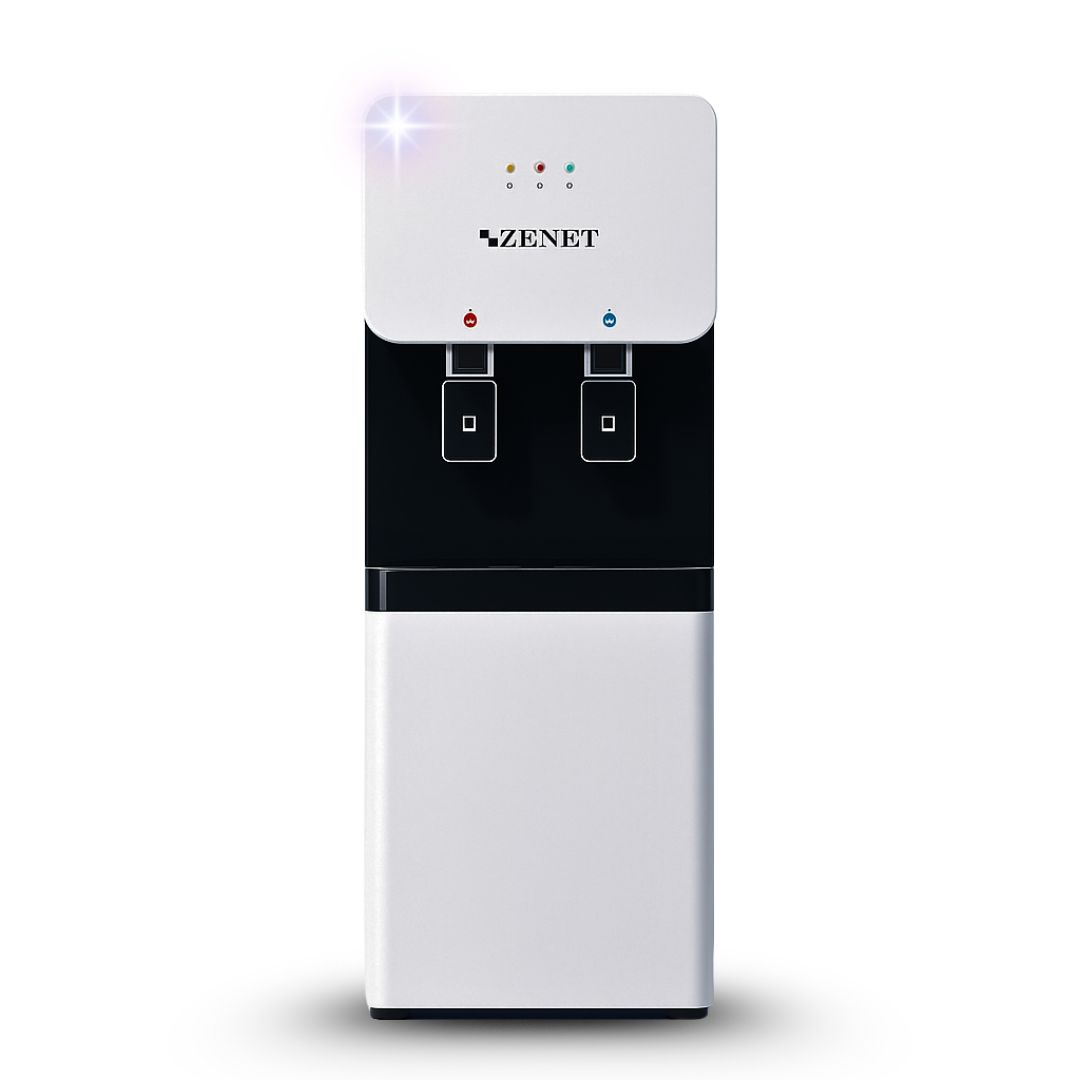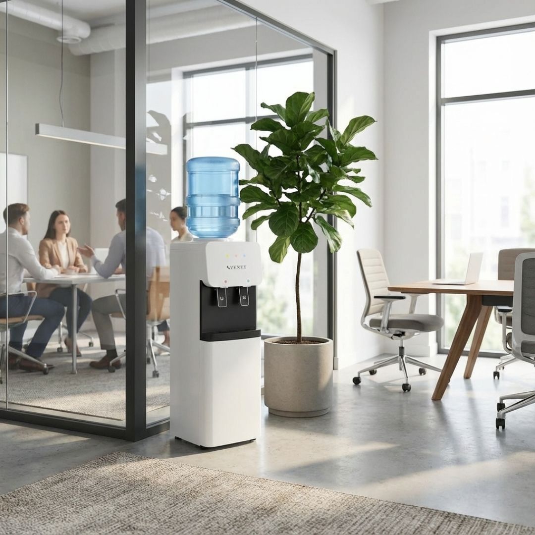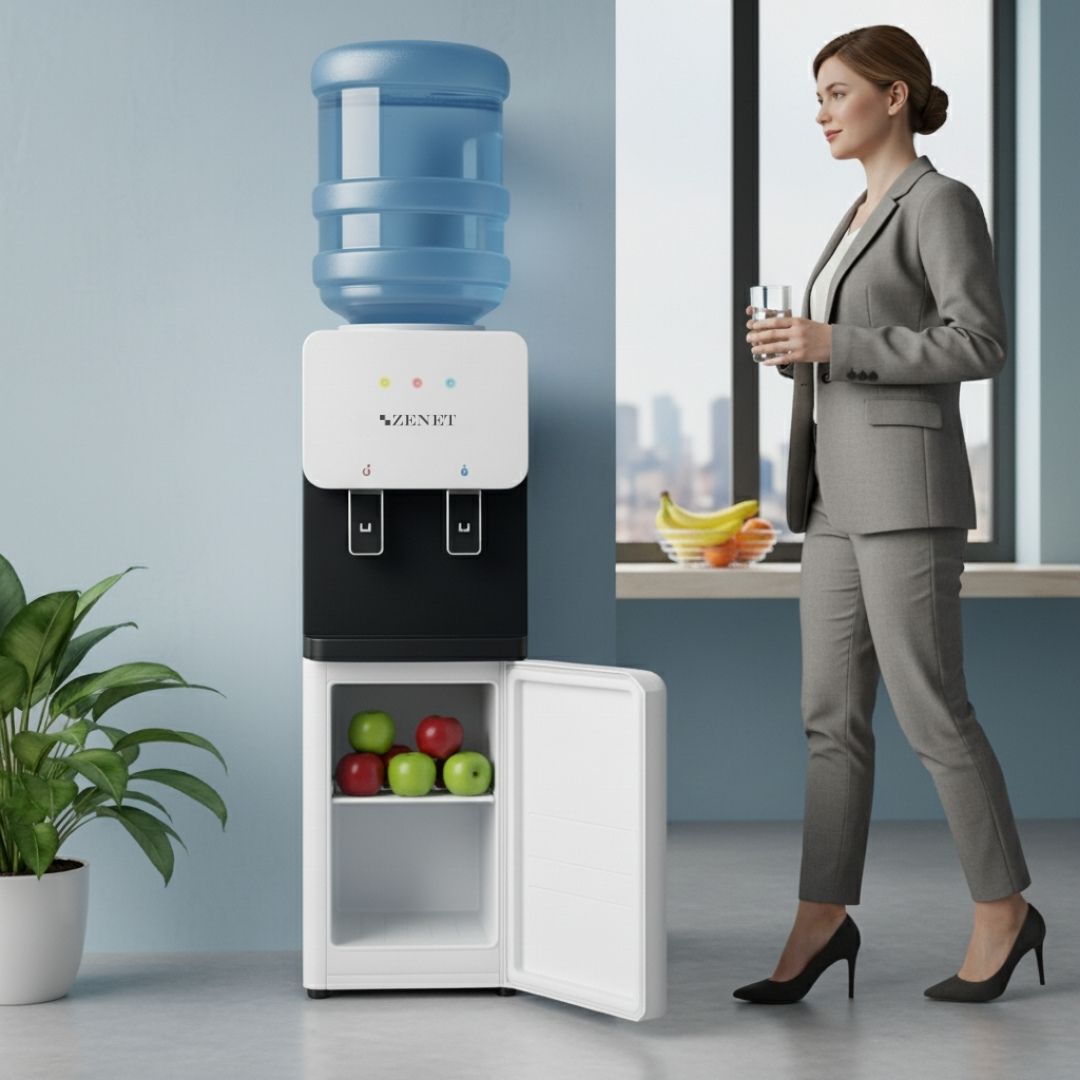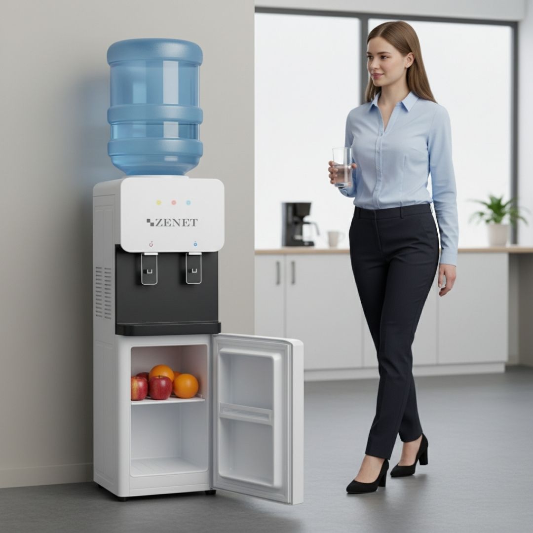 Диспенсърът за вода ZENET ZET-313 съчетава модерен дизайн, надеждна технология и практичен шкаф за съхранение на напитки или храна. Той осигурява топла, студена и стайна вода само с едно докосване – идеално решение за офиси, домове, училища, рецепции или чакални.