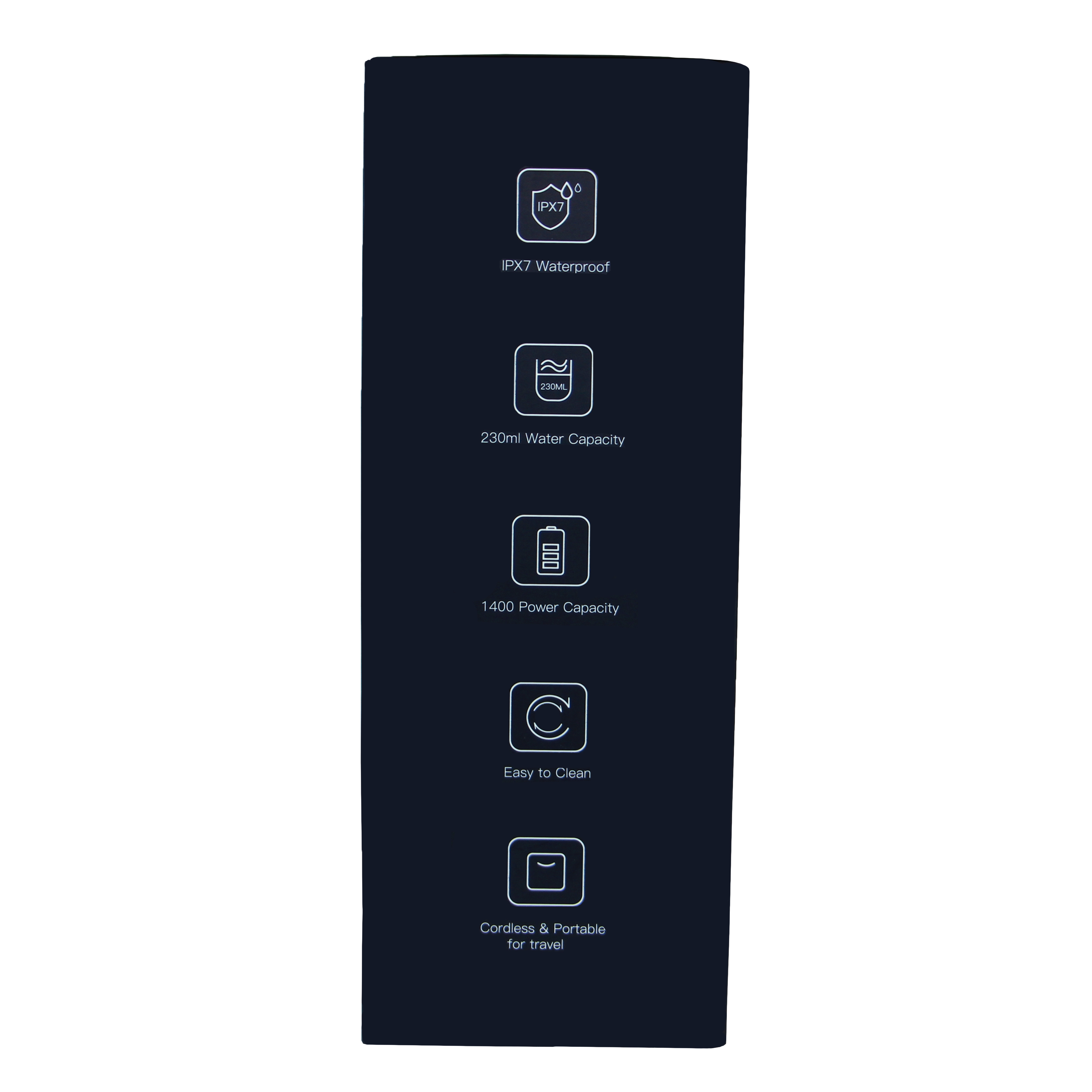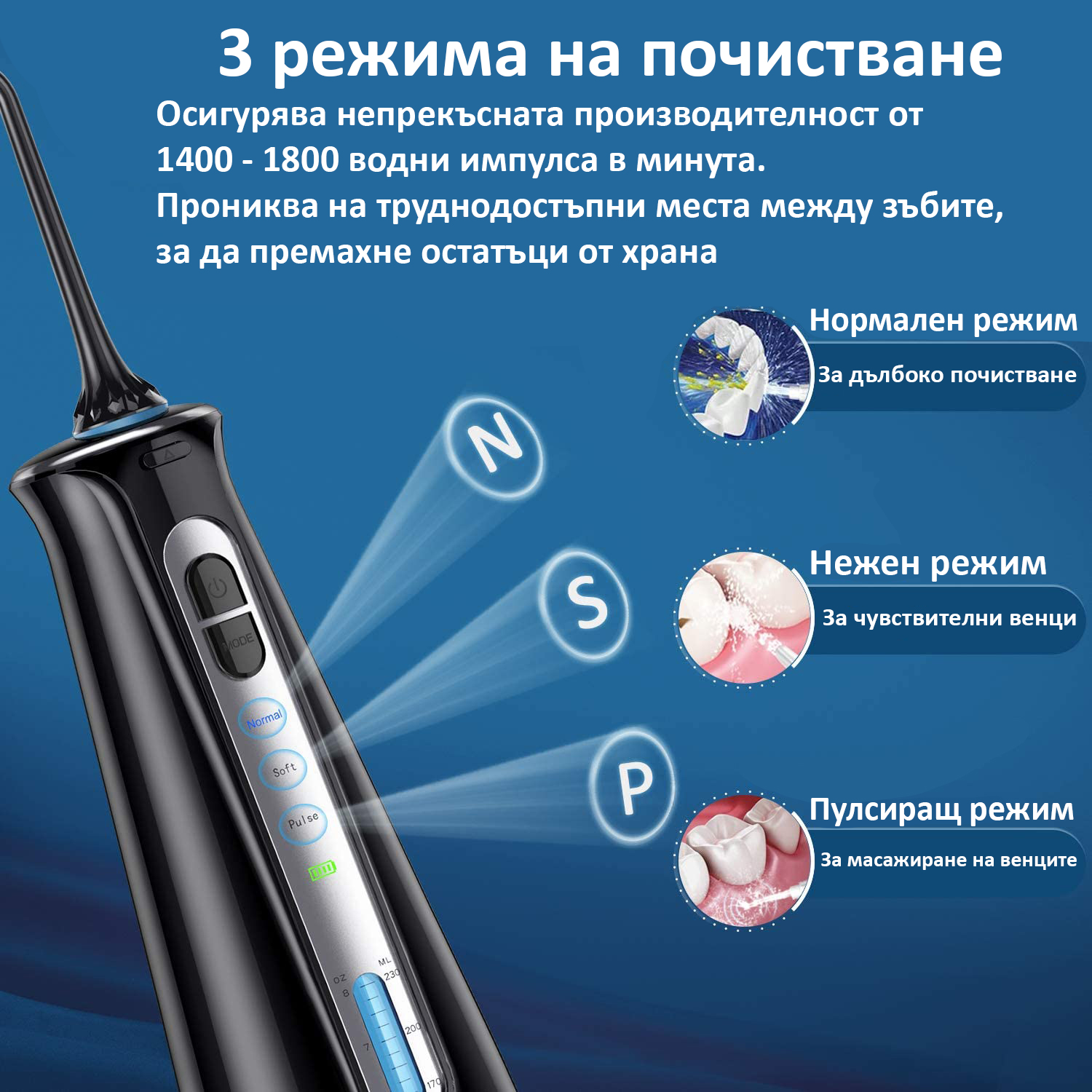 • С 1800 пъти/минута воден импулс под високо налягане, 6 сменяеми струйни накрайника и въртене на 360°. Почиства 99,99% остатъци от храна, които традиционното четкане и почистване с конец не могат да постигнат. Той е идеален за всеки със скоби, импланти, корони, пародонтални джобове или брекети.