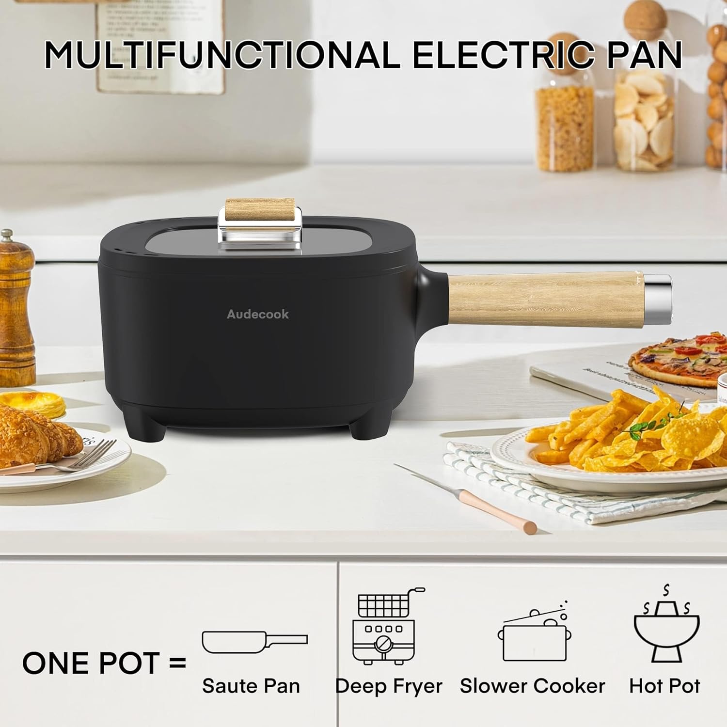 Електрически горещ съд Audecook без пароварка, 2 л/20 см незалепващ електрически тиган с керамична глазура, преносим мултикукър за рамен, стек, яйца, овесени ядки, супа, 350 W/800 W (черен)