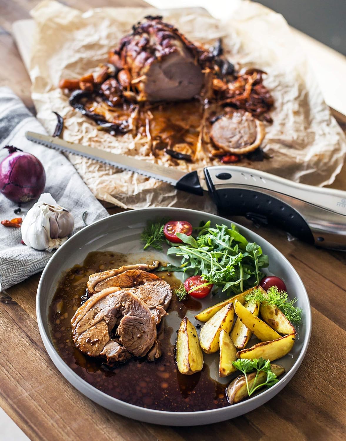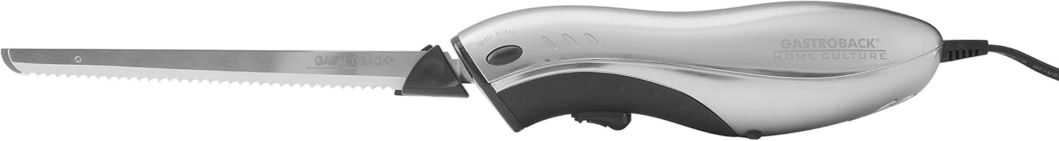 Реже месо, риба, хляб, сладкиши и много други само за няколко секунди. Корпус от неръждаема стомана с гумено покритие за здрав и сигурен захват, ергономичен дизайн. Бутон за изваждане от двете страни за безопасно освобождаване на ножовете.