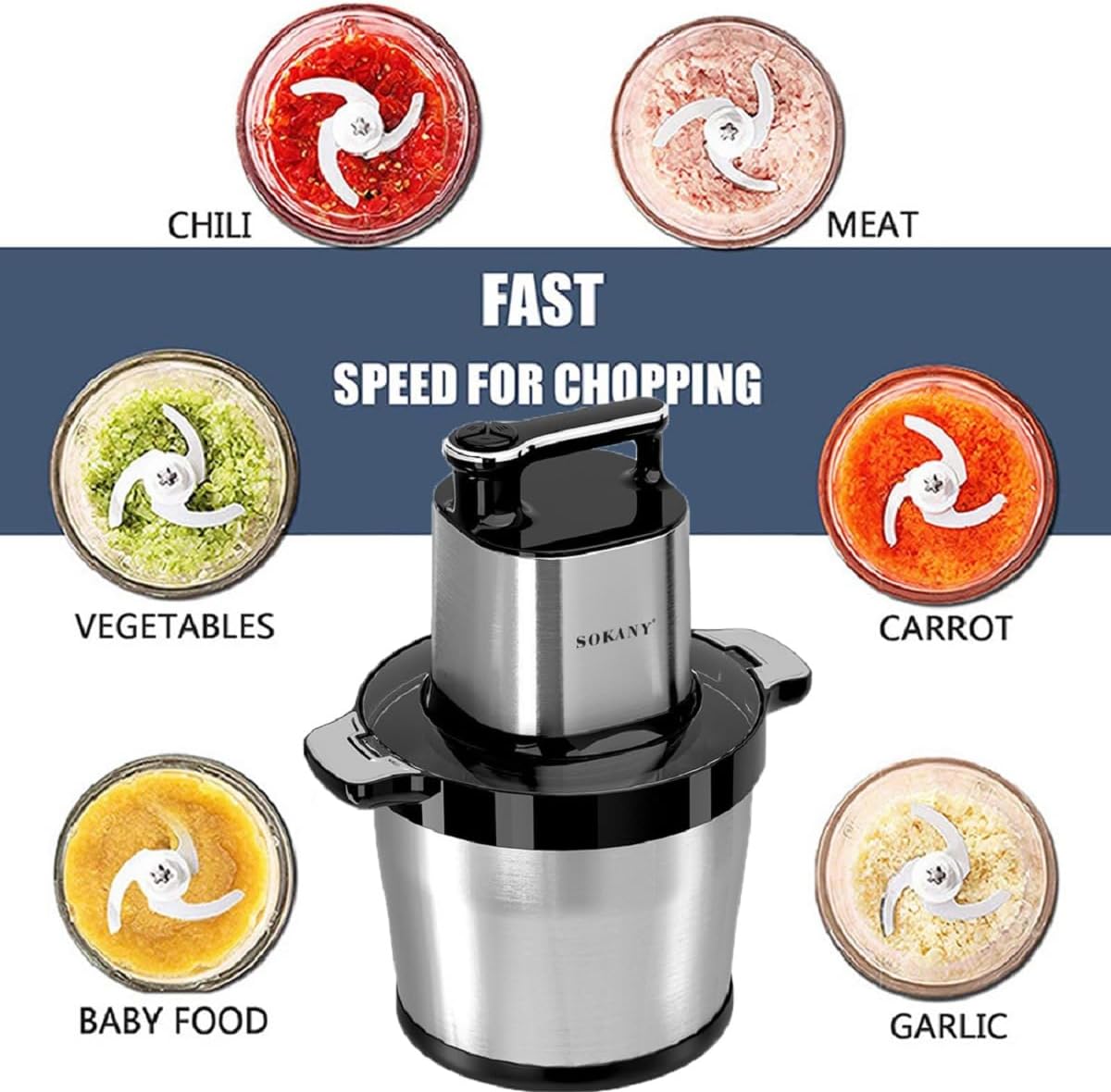 Кухненският чопър Sokany е оборудван с купа от неръждаема стомана 304 и капацитет 8 литра. В сравнение със стъклените купи, той е по-здрав, по-здрав и по-устойчив на удари, което осигурява дълъг експлоатационен живот.