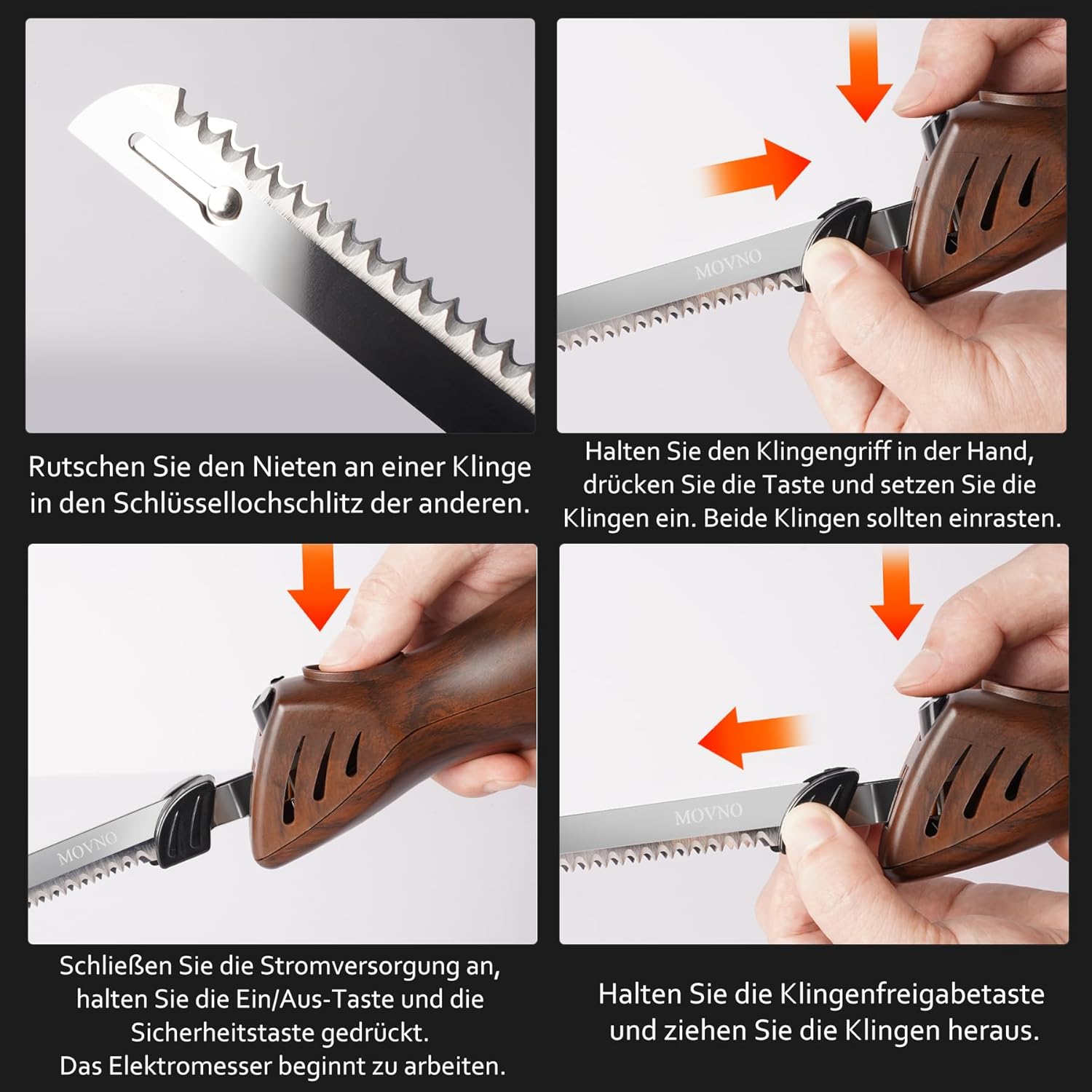 • Изпитайте рязане без усилие: насладете се на радостта от готвенето с универсалния електрически нож за месо от MOVNO. Висококачествените назъбени остриета от неръждаема стомана 340 + 3 едновременни назъбени остриета от неръждаема стомана гарантират, че всеки разрез е чист и равномерен. Независимо дали приготвяте празнично угощение или бързо ястие за вечеря през седмицата, този електрически нож за месо ви позволява без усилие да режете месо, хляб, зеленчуци и филе.