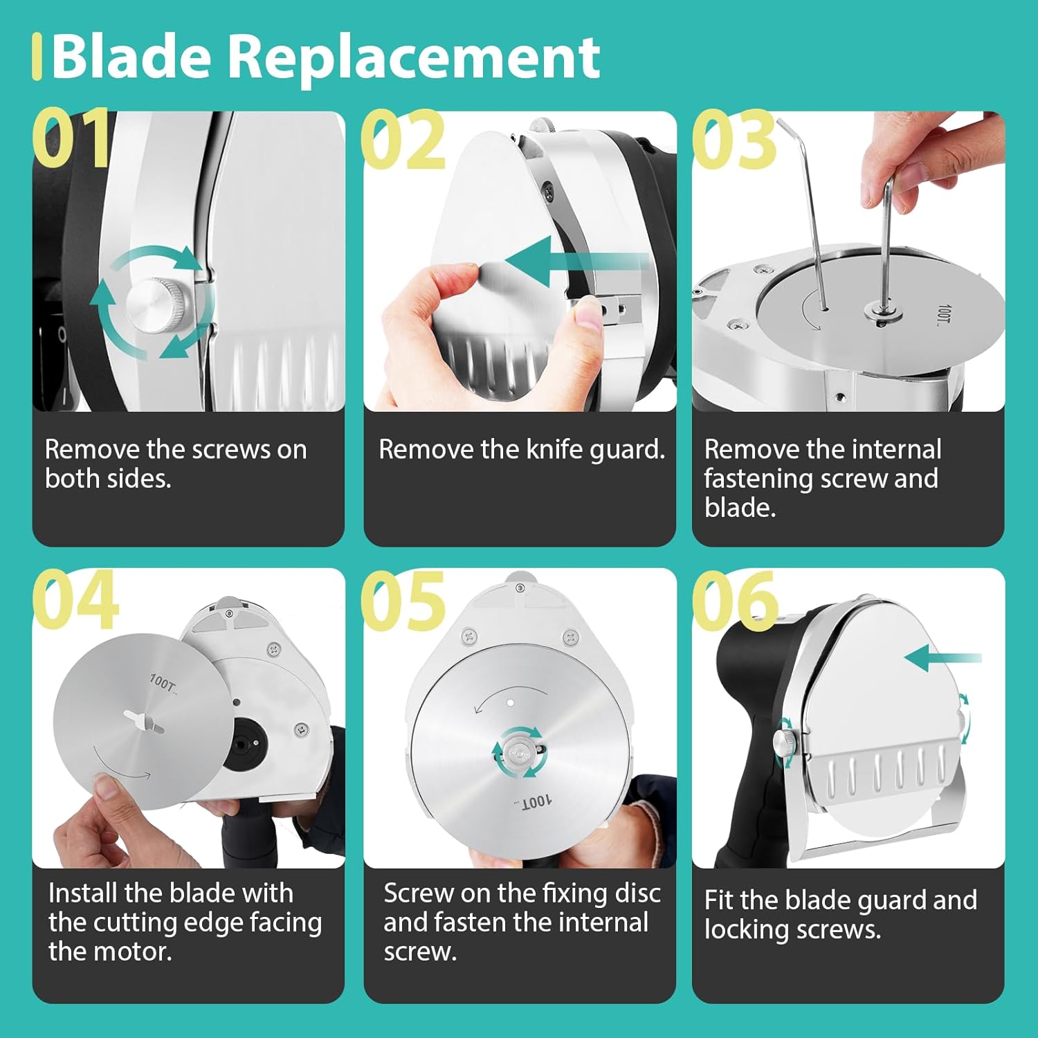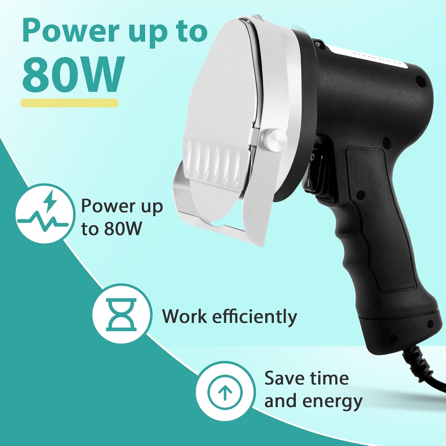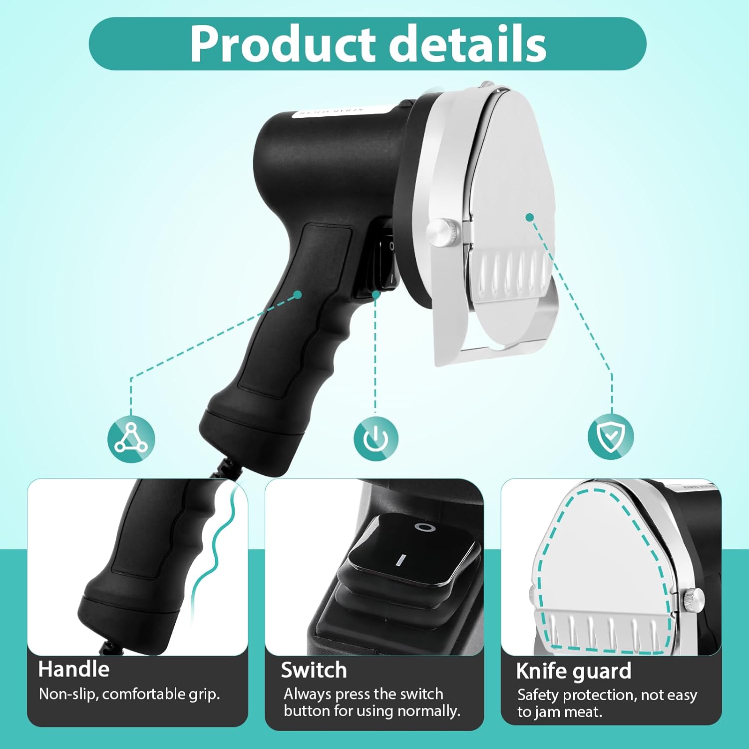 • Мощност 80 W: електрическият нож за кебап е с мощност 80 W и производителност до 60 кг/час. Той бързо реже месото на тънки филийки, подобрявайки вкуса му. Забележка: По време на употреба машината ще издава работен шум.