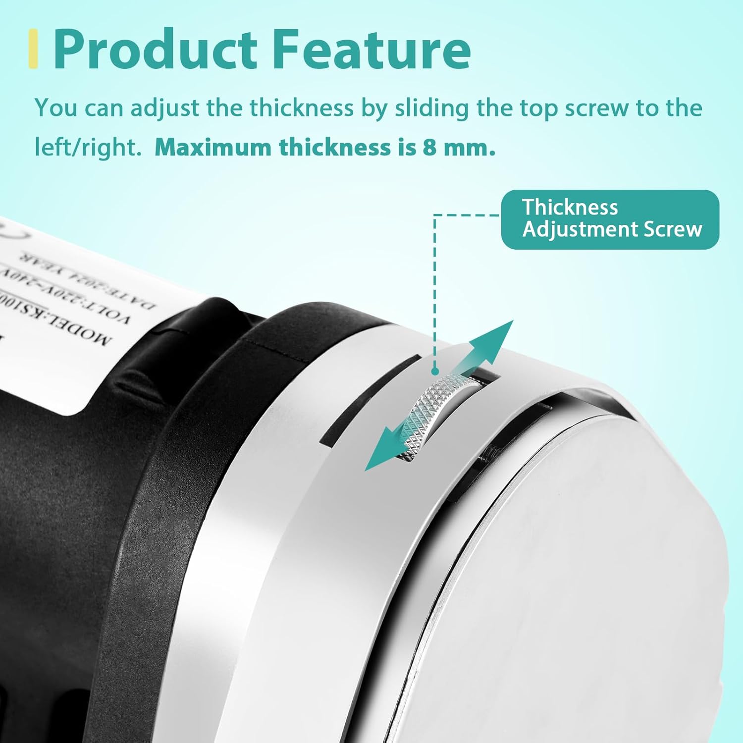 • Регулиране на дебелината на рязане 0,5-8 мм: Чрез просто регулиране на регулиращите винтове в горната част на устройството, дебелината на рязане може да се регулира от 0,5 до 8 мм. Идеално за различни дебелини на месо - от тънка шунка до здрави резени гирос.