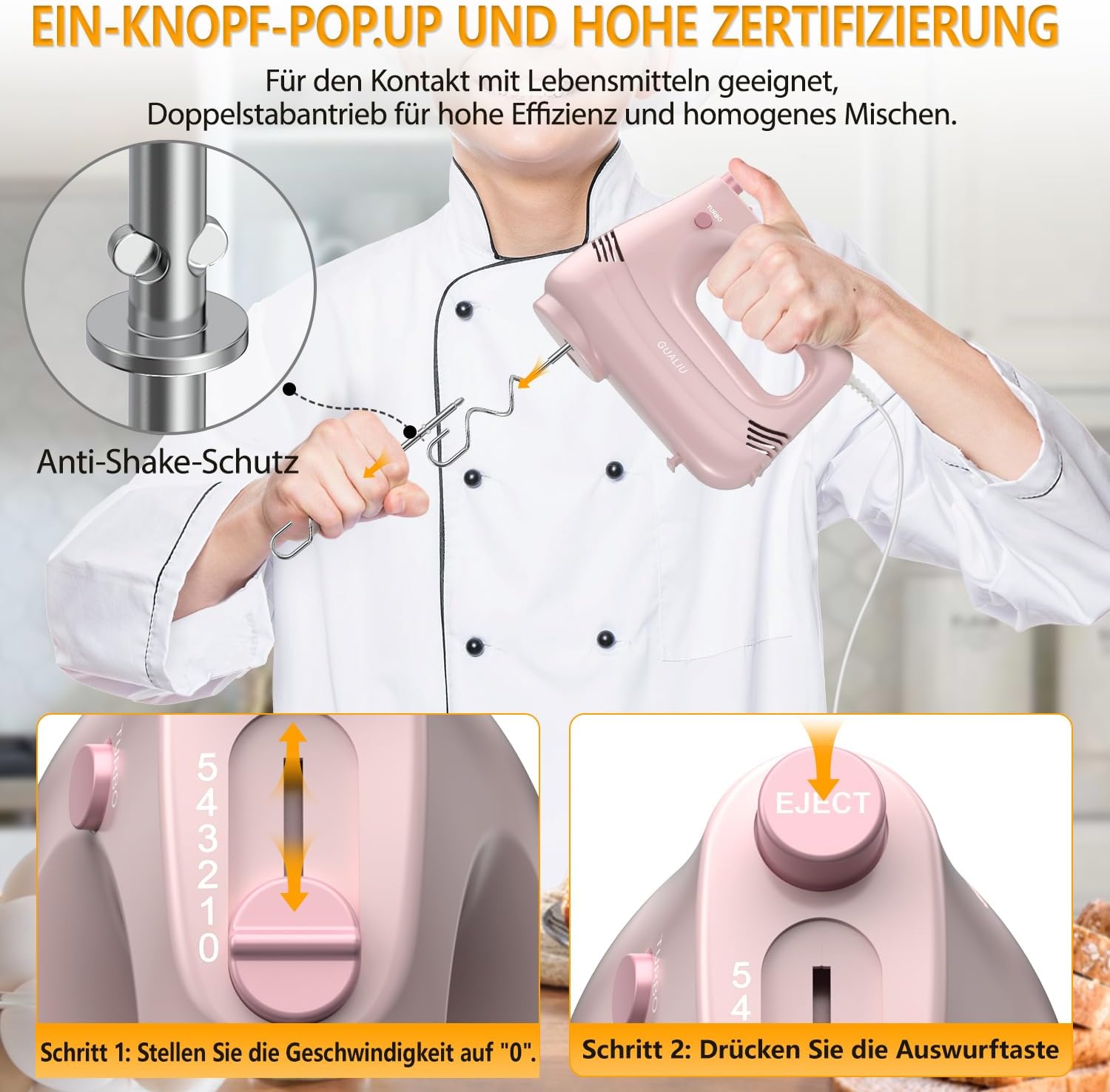Stellen Sie die Geschwindigkeit auf „0“, drücken Sie die Auswurftaste. Aufsätze können zur einfachen Reinigung abgenommen werden