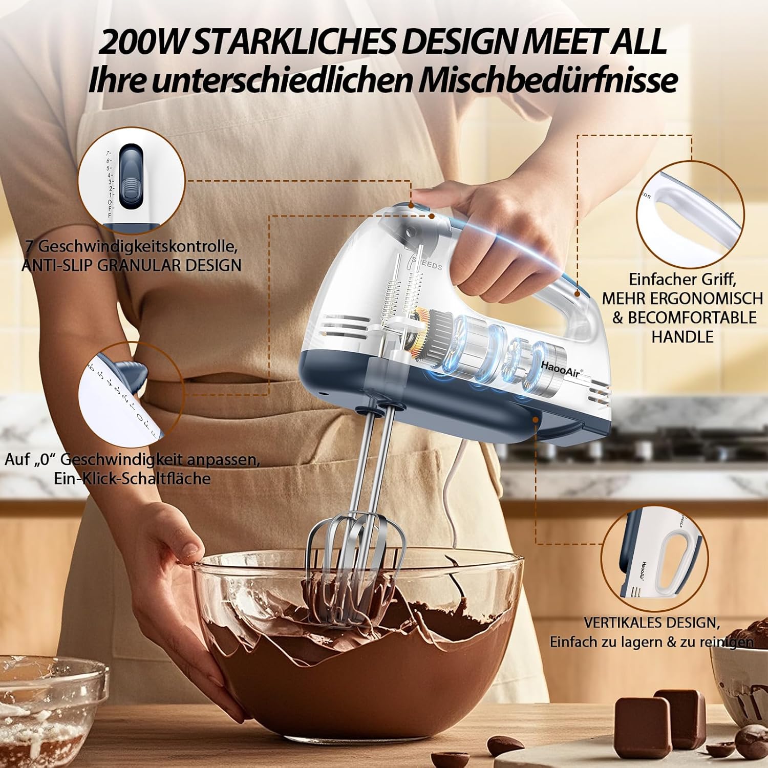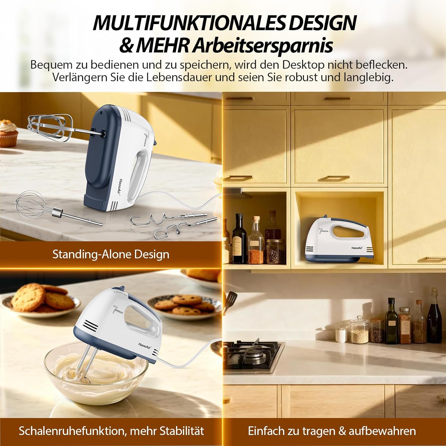 The bottom flitzed bowl support design puts the hand mixer on the edge of the bowl for long hours of mixing without fatigue.