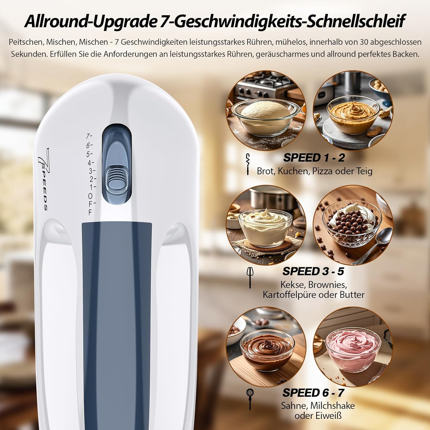 7 adjustable mixing speeds, from 1 lowest speed to 7 highest speeds with corresponding adjustment buttons, you can adjust the speed by pressing the buttons up and down.