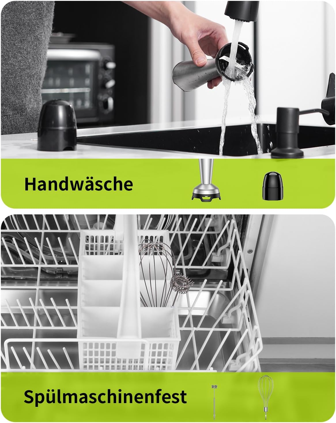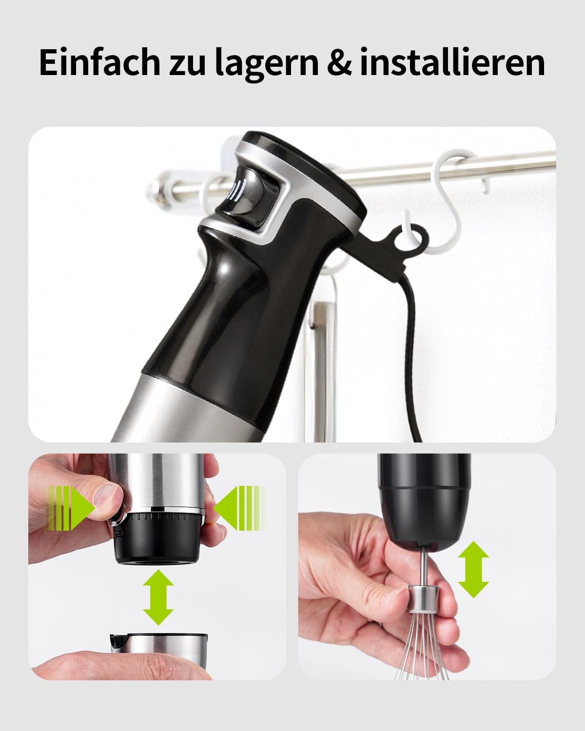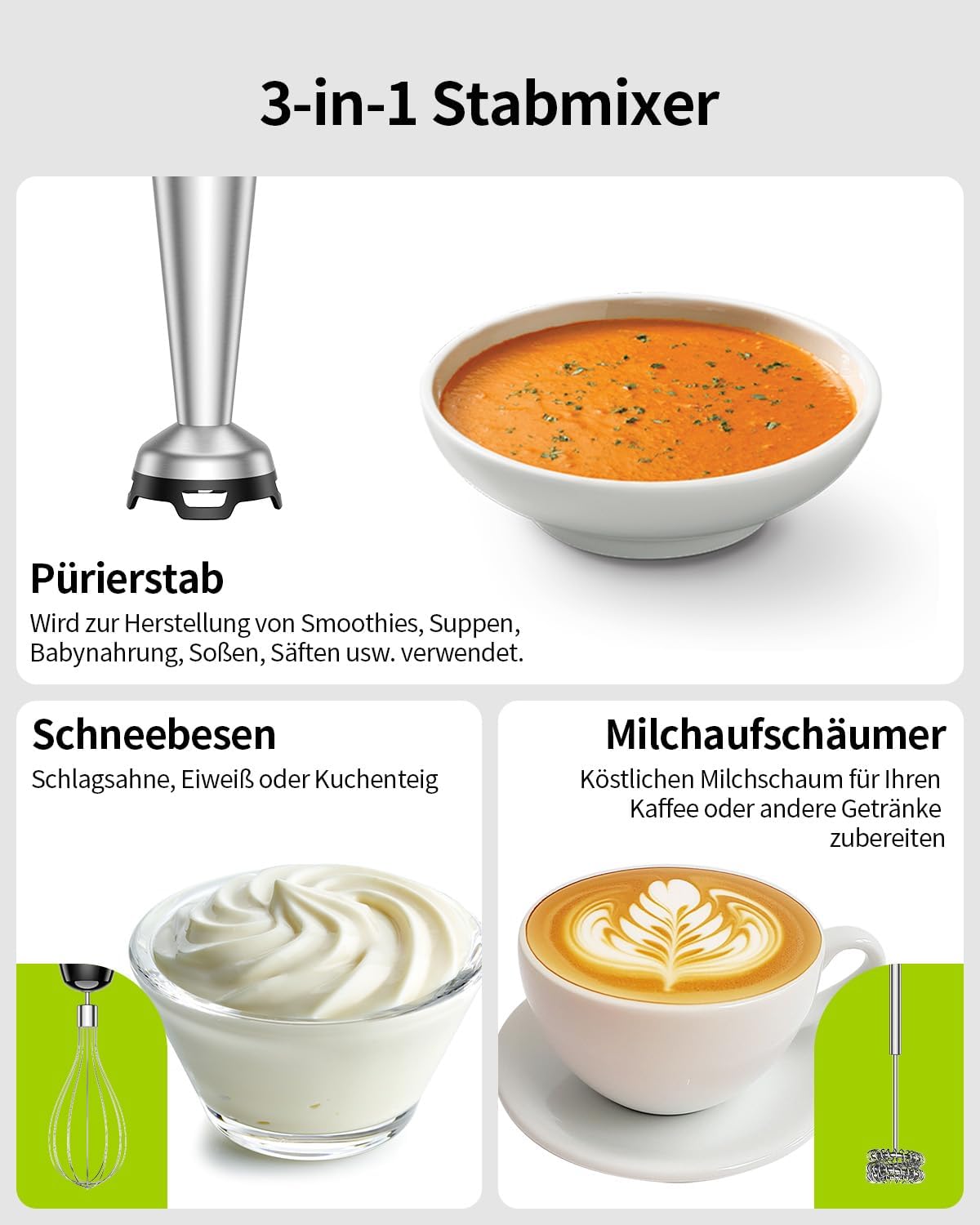 • Многофункционален ръчен миксер 3 в 1: този комплект блендери отговаря на широк спектър от кухненски нужди. Той включва блендер (за супи и сосове), тел (за разбиване на сметана и протеини) и разпенител за мляко (за разпенване на капучино). От основни ястия до печени десерти и приготвяне на изискани напитки, този комплект е вашият универсален помощник.