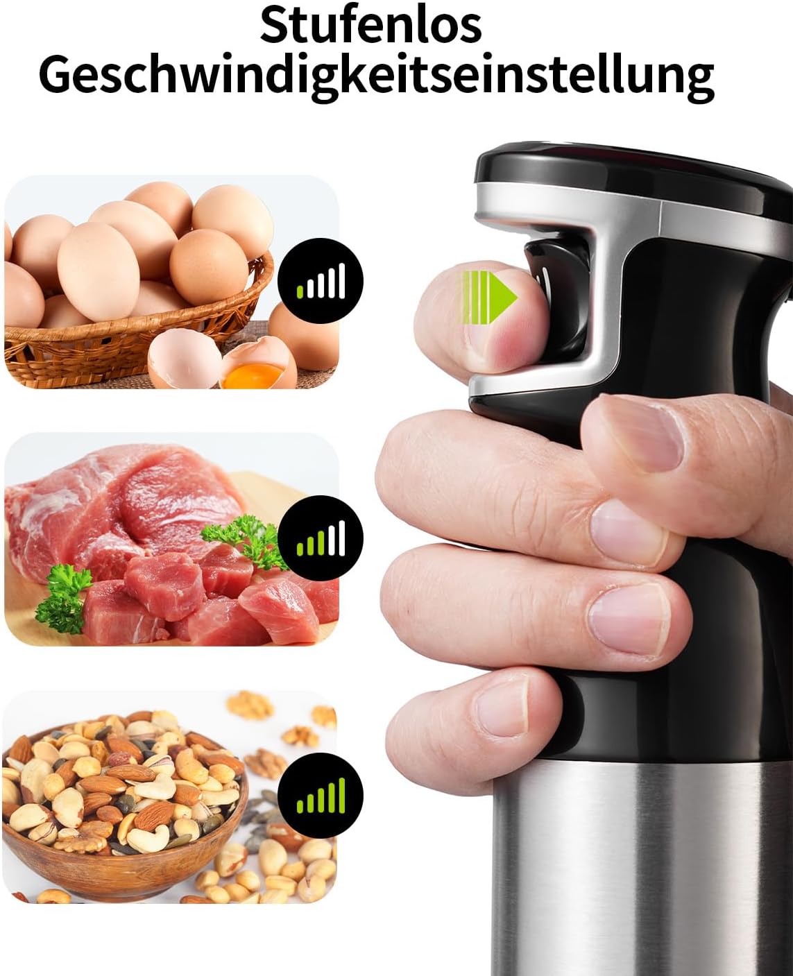 • 1100 W високопроизводителен мотор и непрекъснат контрол на скоростта: Нашият ръчен блендер има мощен 1100 W мотор, който без усилие обработва всички видове твърди съставки, независимо дали пасирате сурово месо, трошите лед или смесвате гъсто тесто. Уникалният контрол на скоростта с функция push-to-go позволява плавен преход от ниска към висока скорост само с едно докосване на пръста, което ви дава прецизен контрол върху консистенцията на храната.