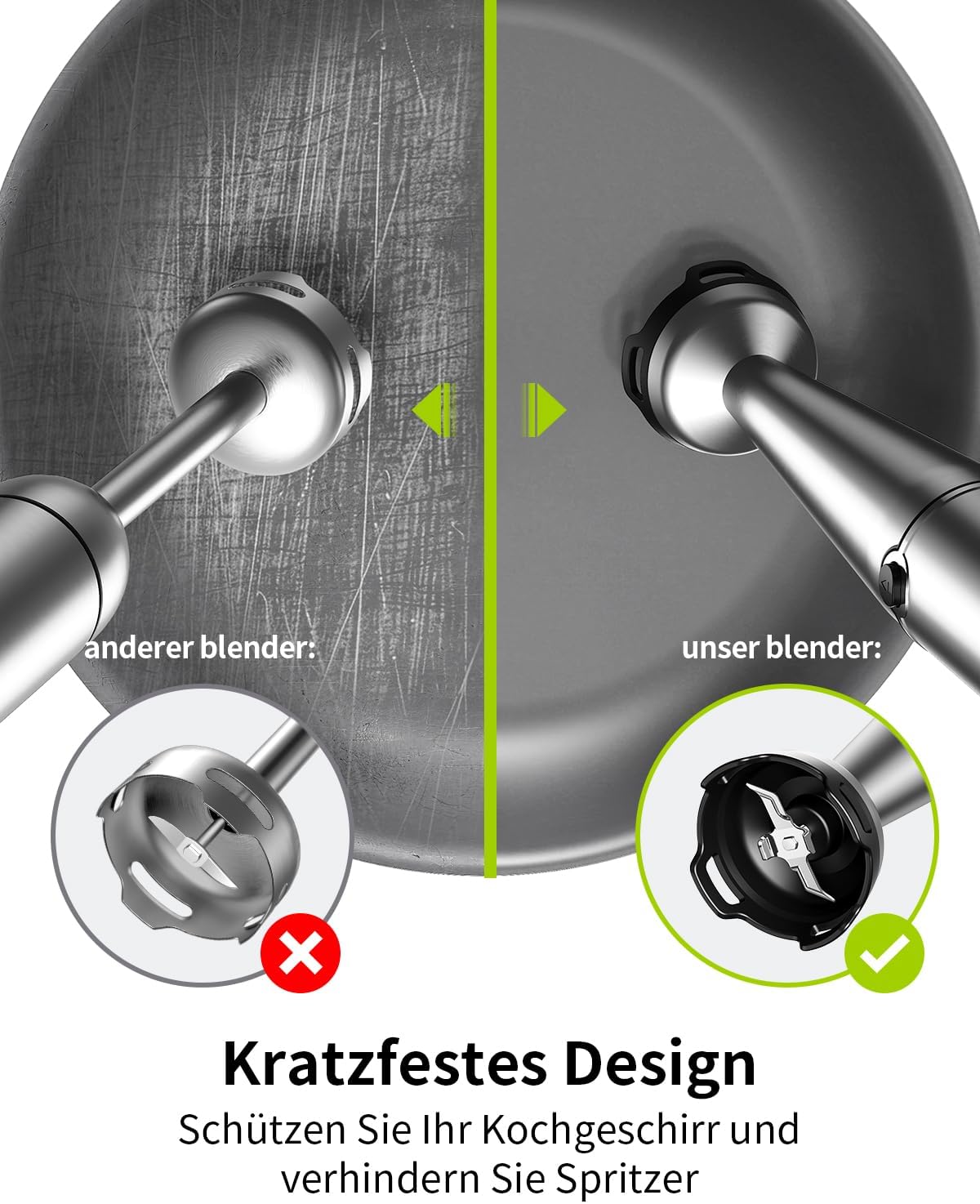 • Предпазва от надраскване и пръски в контейнера: нашият блендер има подобрена защита на ножовете, която предотвратява надраскване на тенджери, тигани и други съдове. Уникалният защитен капак с форма на камбана също предотвратява пръски за безупречна кухня и бързи, фини резултати при смесване.