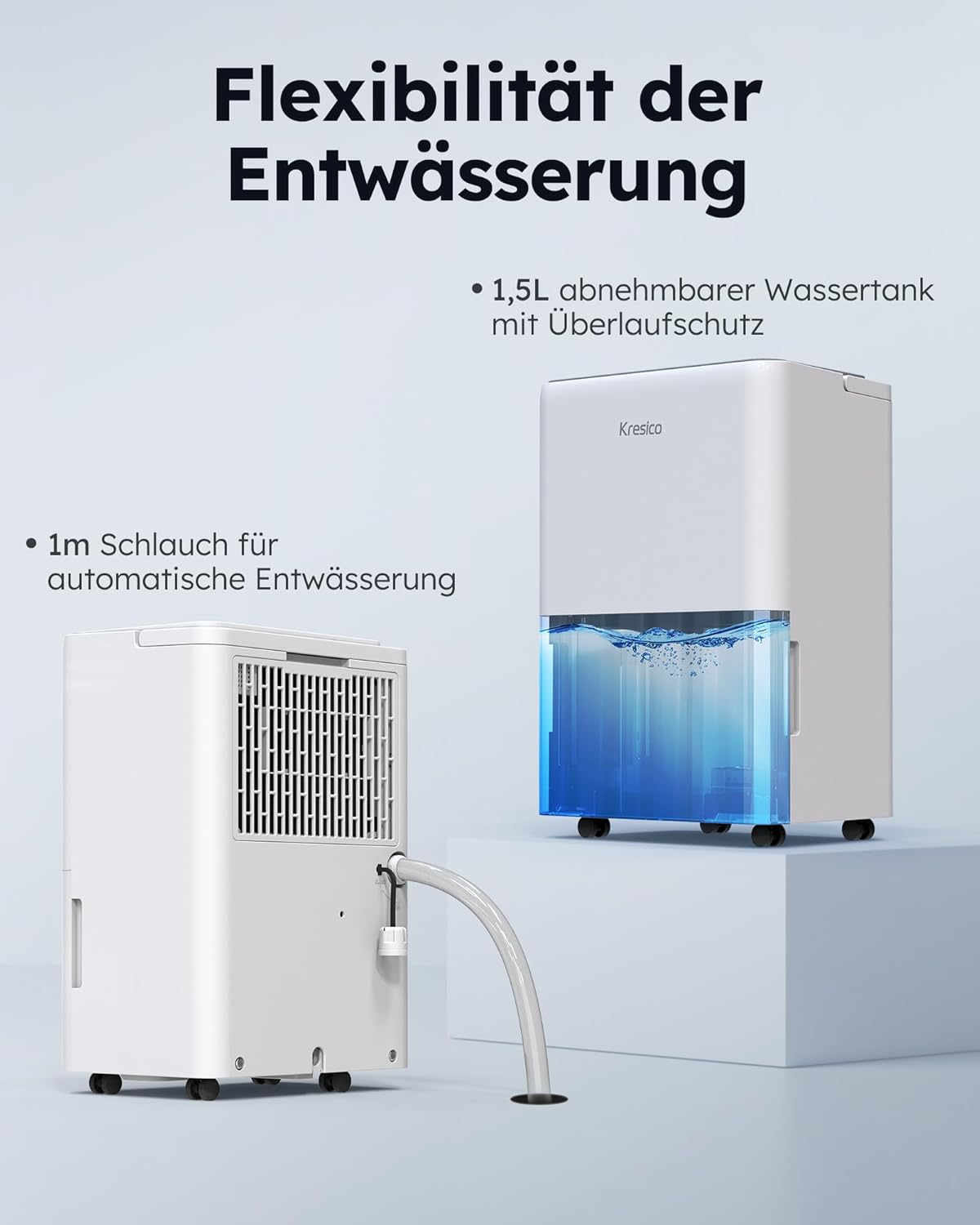 • Two options, flexible drainage: The 20L dehumidifier impresses with a 3.4L water tank with level indicator, which automatically switches off when fully capacity and can be easily emptied thanks to the removable design. The dehumidifier with drain hose allows continuous water drainage without manual emptying. The double drainage system is suitable for all rooms from basement to bathroom and adapts perfectly to your needs.
