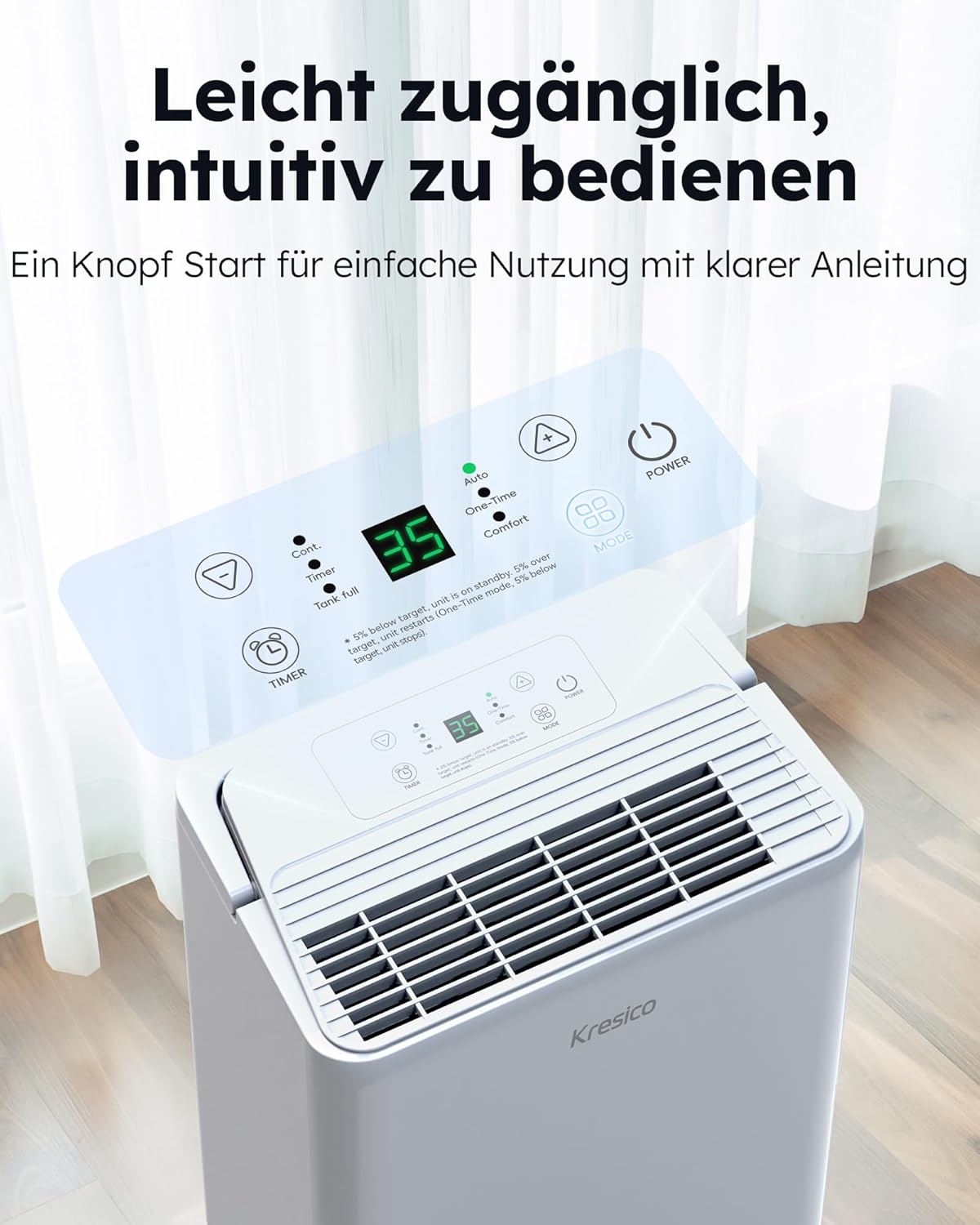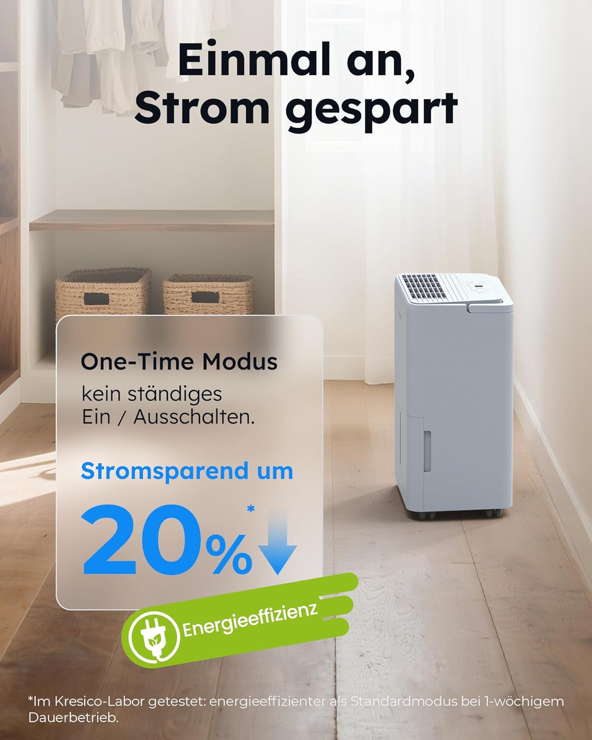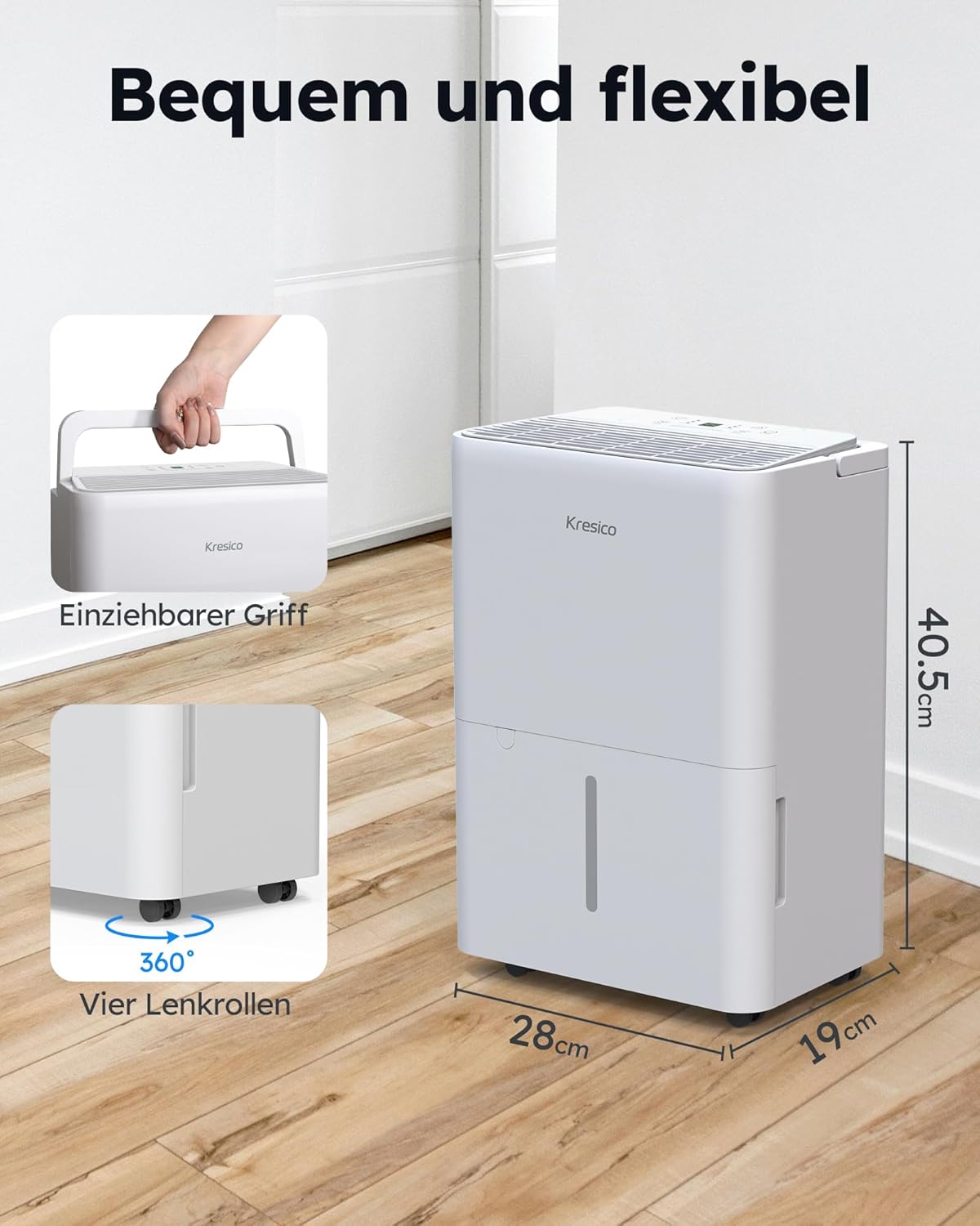 • Изтънчен дизайн: с четири колела, въртящи се на 360°, и практична дръжка за носене, влагоабсорбаторът може лесно да се премести във всяка стая. Миещият се филтър поддържа въздуха свеж и здравословен - без скъпи резервни части. Електрическият влагоабсорбатор има автоматично рестартиране с функция за памет след прекъсване на захранването и вграден 24-часов таймер. Настройте времето за работа според ежедневието си и се насладете на перфектен вътрешен климат по всяко време.