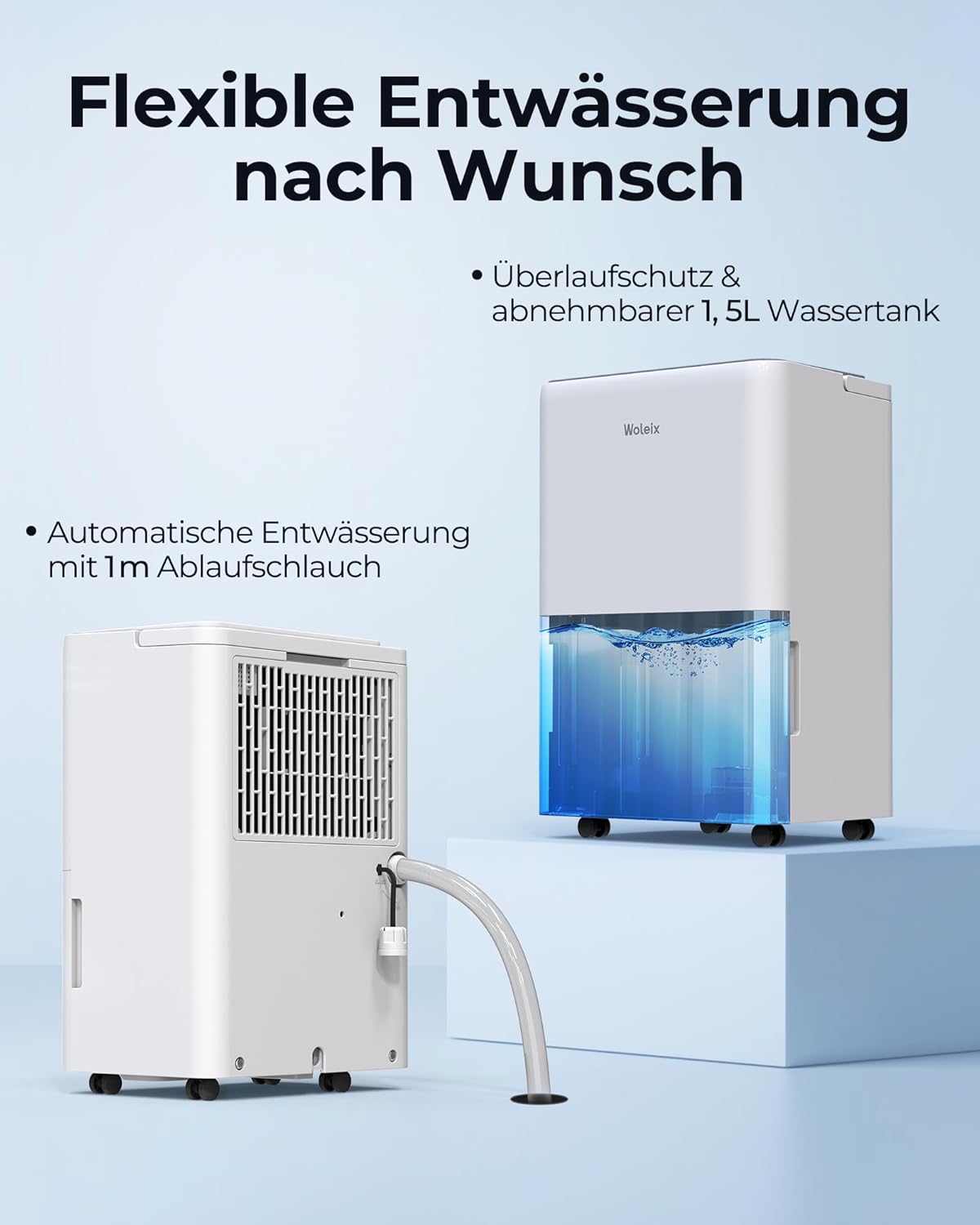 • Двойна дренажна система: Нашият електрически влагоабсорбатор предлага гъвкав 2-в-1 дизайн: 1,5-литров видим резервоар за вода с автоматично спиране при напълване за ежедневна употреба – плюс непрекъснато оттичане с 1-метров маркуч за непрекъсната работа във влажни помещения. Без досадно изпразване, просто настройте и започнете.