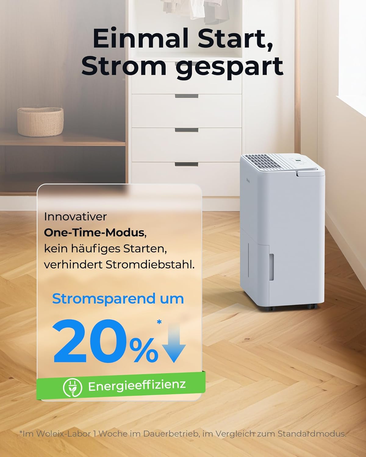 • Ексклузивен еднократен режим: Само с една настройка, нашият електрически влагоабсорбатор осигурява приятен вътрешен климат по всяко време. Въз основа на над 30 000 потребителски опита, ексклузивният еднократен режим се изключва автоматично, след като се достигне желаното ниво на влажност – без необходимост от постоянно включване и изключване. Идеален за помещения със стабилна влажност, той спестява до 20% енергия в сравнение с конвенционалните електрически влагоабсорбатори и също така удължава експлоатационния живот на устройството.