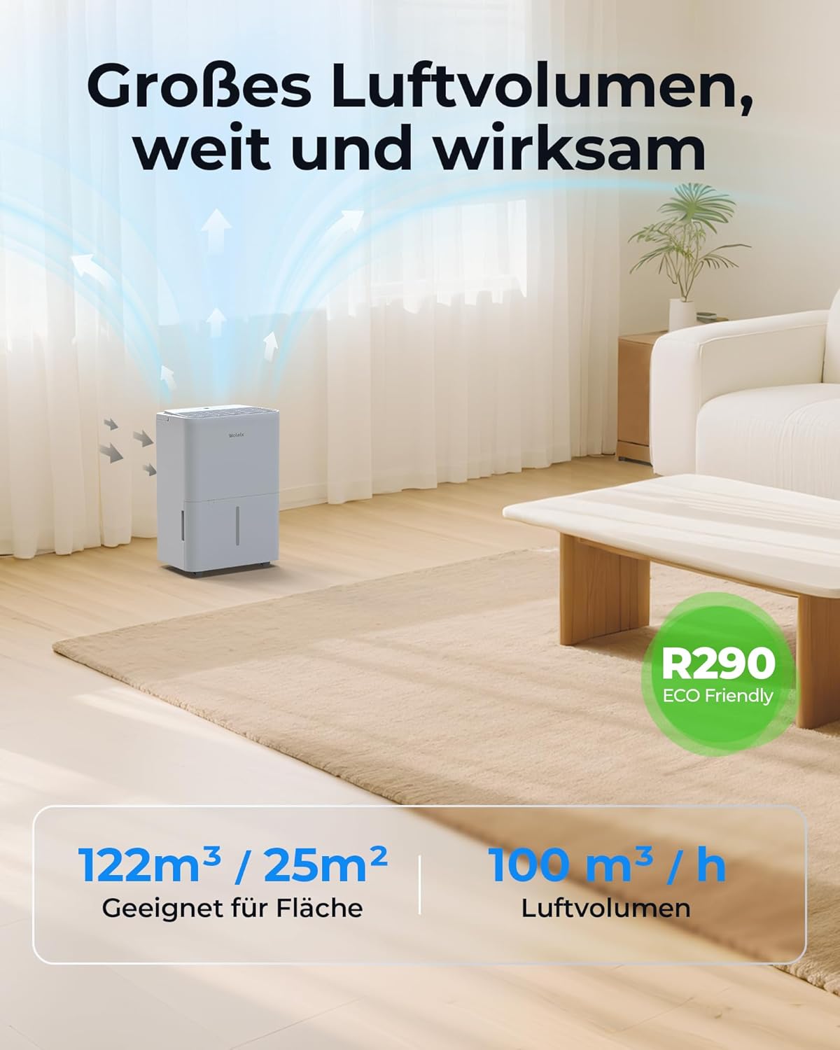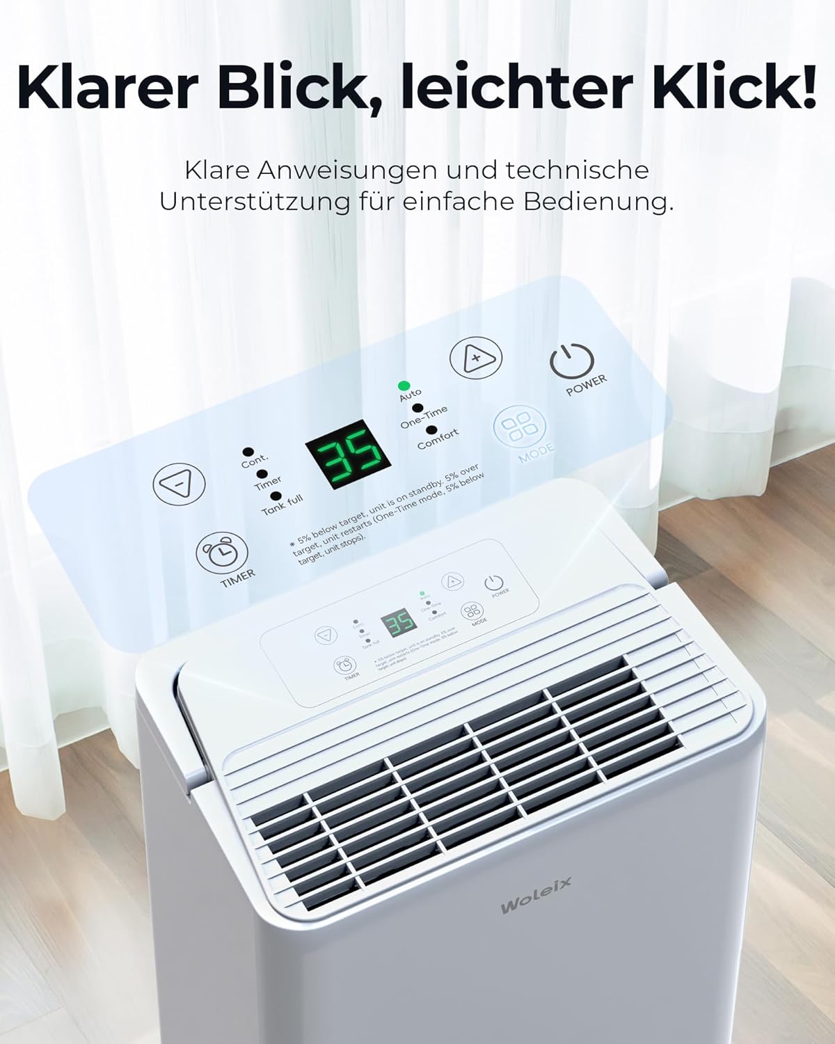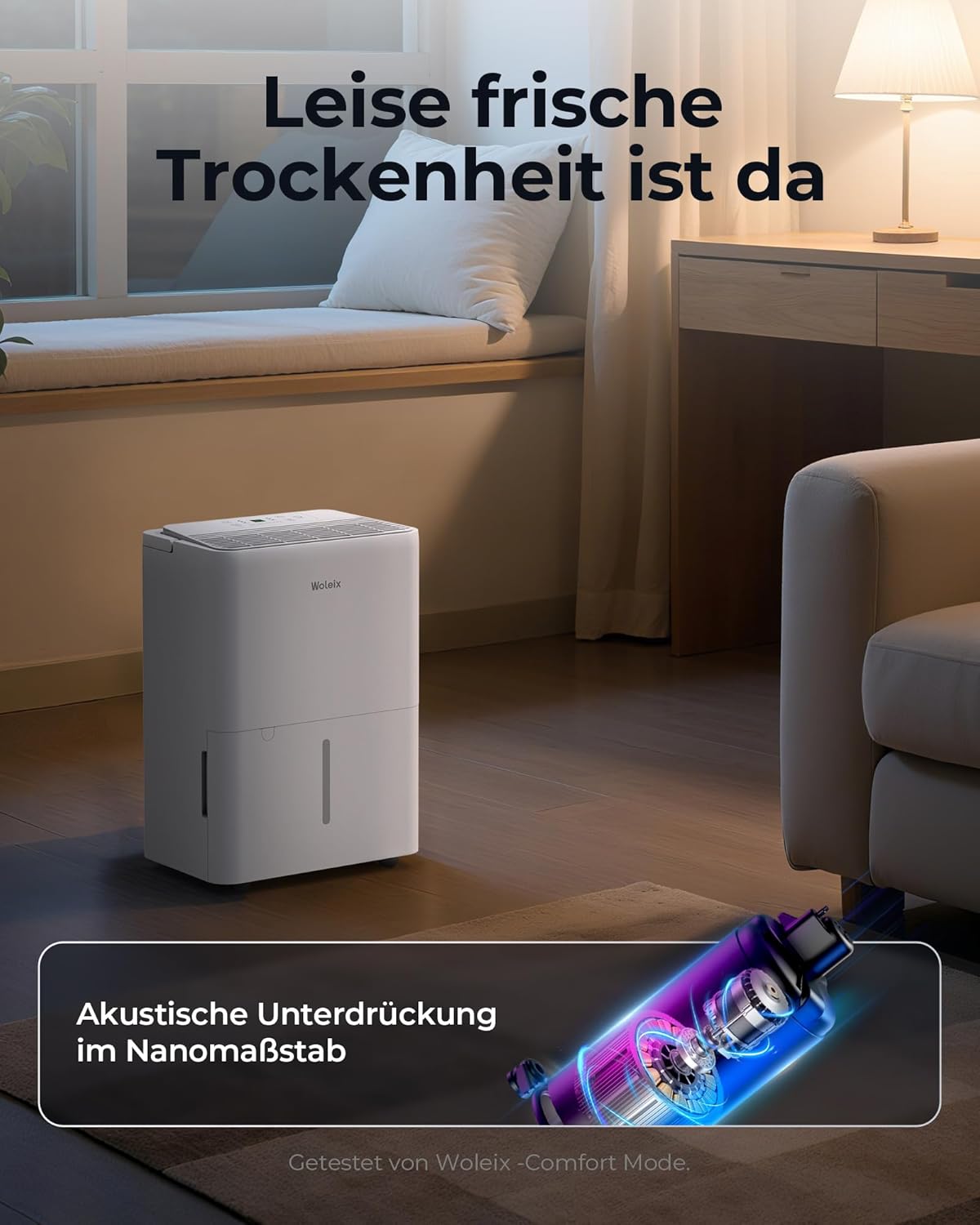 • Изключително тиха работа: Нашият електрически влагоабсорбатор използва тройно намаляване на шума – тих компресор, вихров въздуховод и звукоизолиран корпус – само за 35 dB в комфортен режим. Компресорът, разработен от TCL и Woleix, намалява вибрациите, бионичният въздушен поток намалява шума от потока, а изолацията минимизира резонанса. Влагоабсорбаторът използва електричество, за да осигури оптимален вътрешен климат – без никакви досадни шумове.