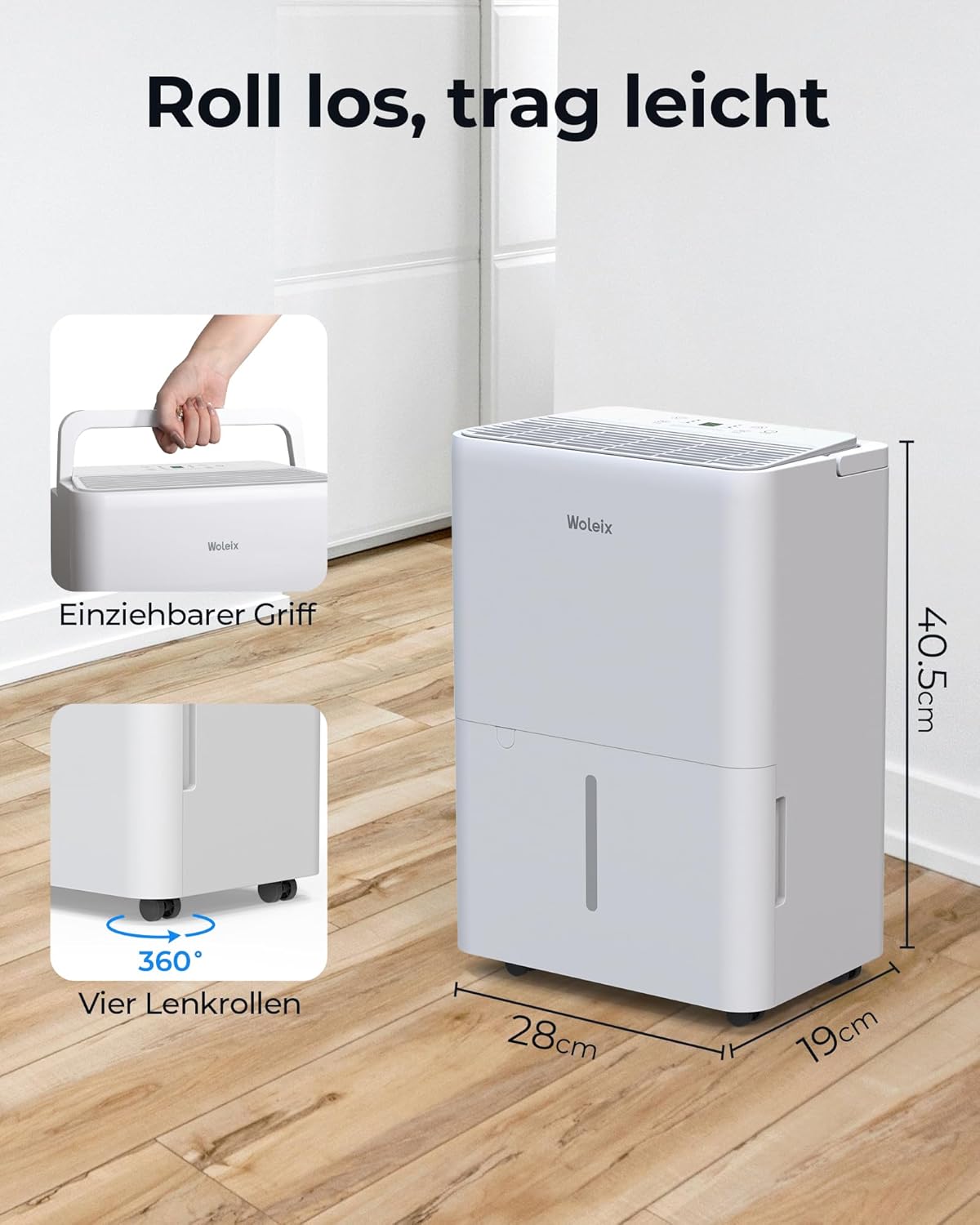 • Удобен за потребителя дизайн: Благодарение на безшумните си колелца, въртящи се на 360°, и ергономичната дръжка, влагоабсорбаторът може да се мести без усилие с една ръка. Антибактериалният дизайн и подвижният филтър на влагоабсорбатора предотвратяват появата на мухъл и осигуряват свеж, здравословен въздух – за здравословен вътрешен климат.
