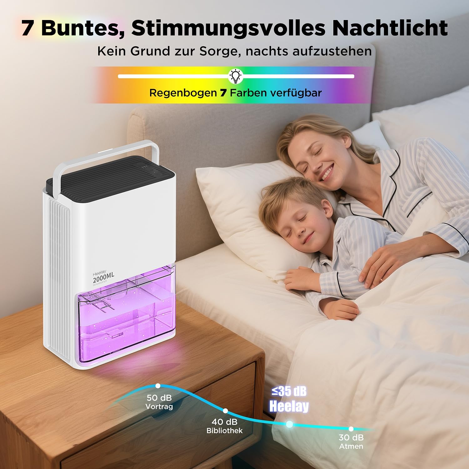 Електрически влагоабсорбатор, 2000 мл, тих влагоабсорбатор за стаи, енергоспестяващ, автоматично изключване, 7-цветна светлина, против влага и мухъл за спалня, баня, дом