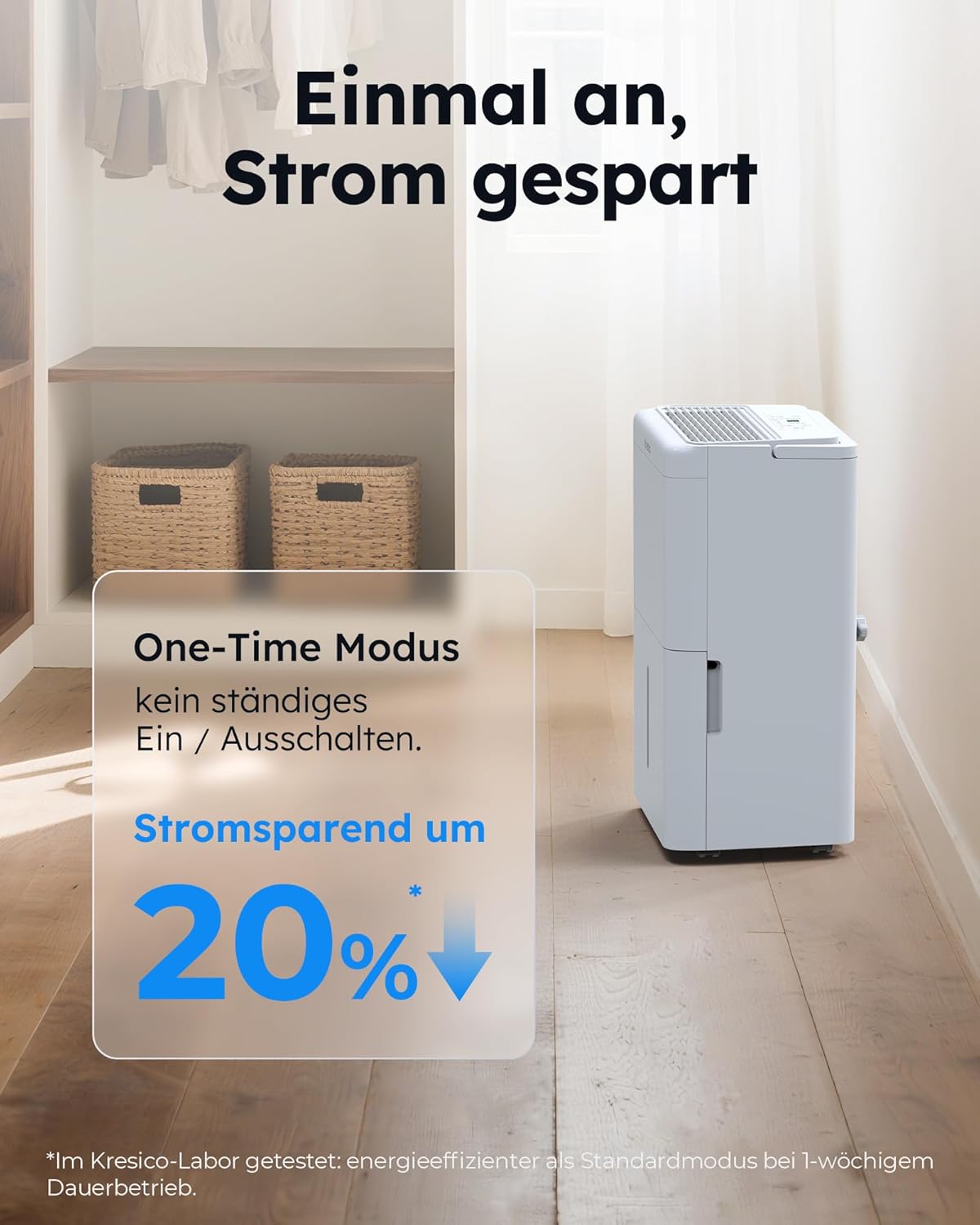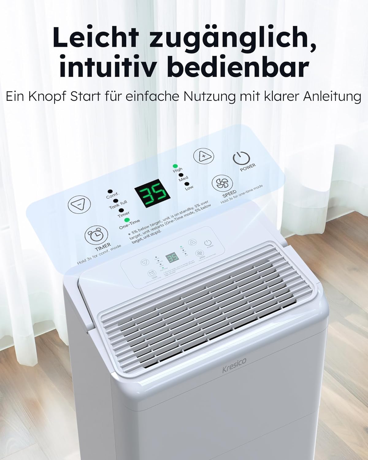 • Изтънчен дизайн: с четири колела, въртящи се на 360°, и практична дръжка за носене, влагоабсорбаторът може лесно да се премести във всяка стая. Миещият се филтър поддържа въздуха свеж и здравословен - без скъпи резервни части. Електрическият влагоабсорбатор има автоматично рестартиране с функция за памет след прекъсване на захранването и вграден 24-часов таймер. Настройте времето за работа според ежедневието си и се насладете на перфектен вътрешен климат по всяко време.