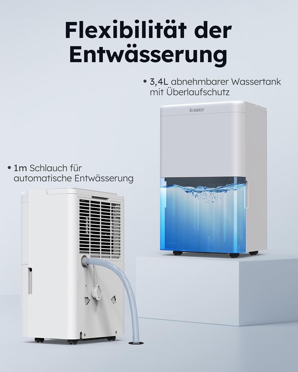 • Two options, flexible drainage: The 20L dehumidifier impresses with a 3.4L water tank with level indicator, which automatically switches off when fully capacity and can be easily emptied thanks to the removable design. The dehumidifier with drain hose allows continuous water drainage without manual emptying. The double drainage system is suitable for all rooms from basement to bathroom and adapts perfectly to your needs.
