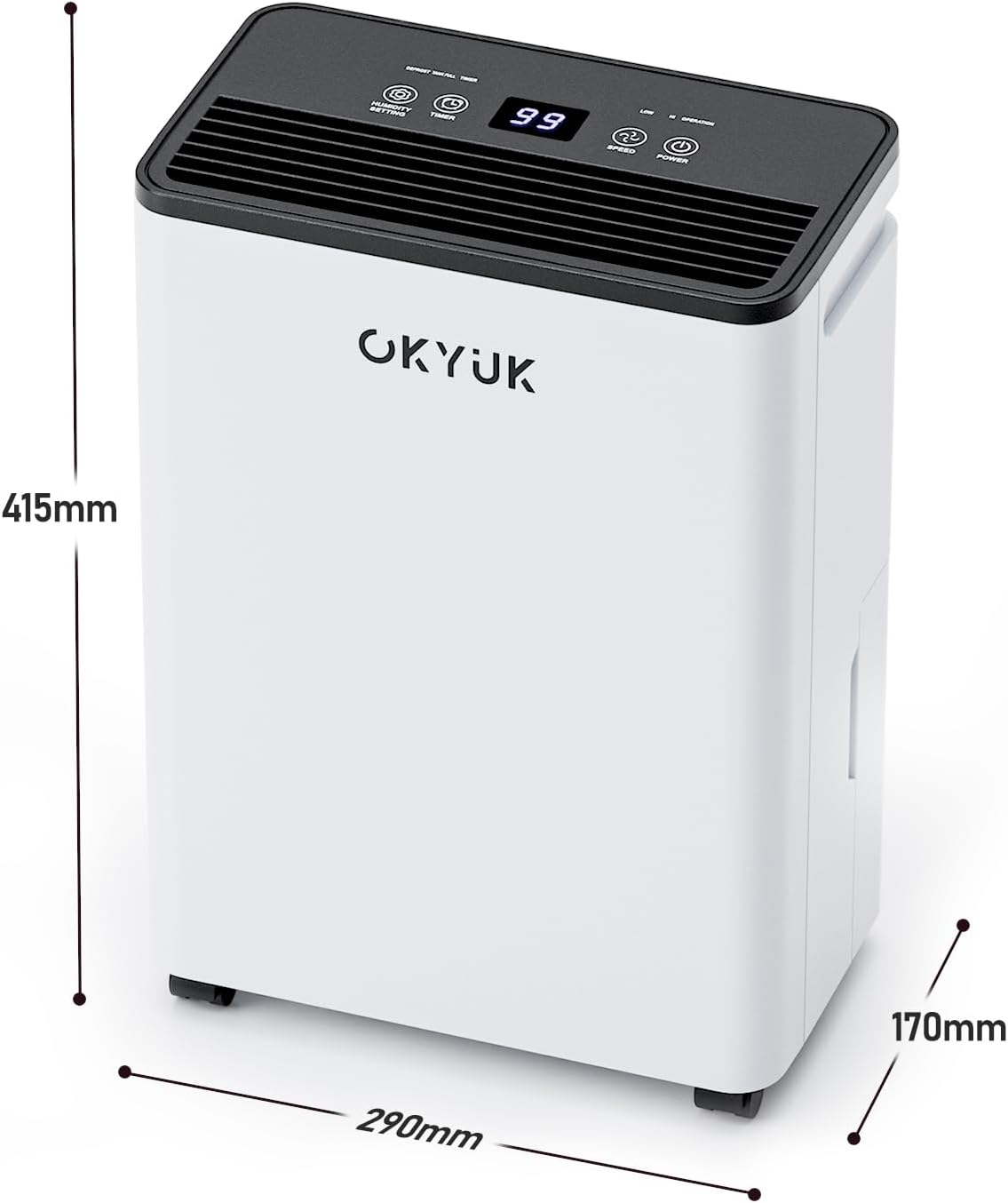 • OKYUK 12 L мощно обезвлажняване: електрическият обезвлажнител за помещения до приблизително 40 м², който разсейва до 12 литра влага на ден, изсушава въздуха в помещението и осигурява приятен климат през целия влажен сезон. Използвайте 24-часовия таймер, за да поддържате относителната влажност в препоръчителния оптимален диапазон от 30%-50% през целия ден.