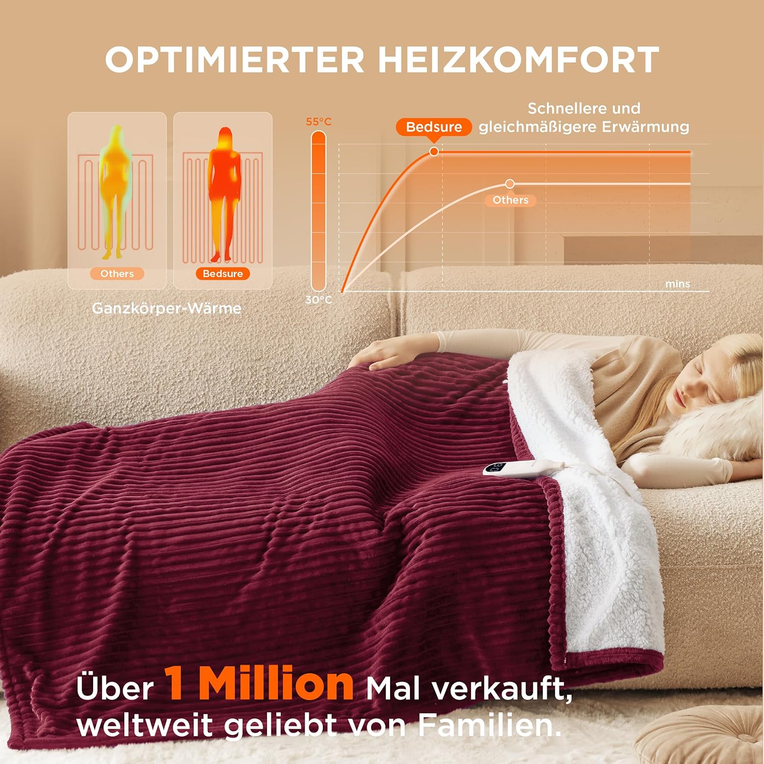 Електрическо одеяло BEDSURE с автоматично изключване, 130 x 180 см, Термо одеяло с 6 степени на топлина и 10-часов таймер, защита от прегряване до 8 часа, електрическо пухкаво одеяло за дома и офиса