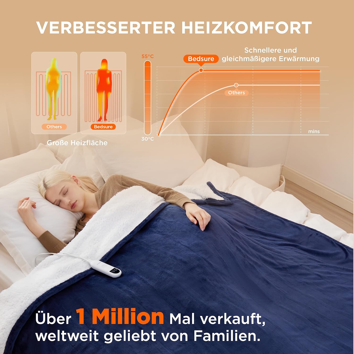 Електрическо одеяло BEDSURE с автоматично изключване 180 x 200 см - Термо одеяло с 6 степени на топлина и 10-часов таймер, защита от прегряване до 8 часа, електрическо пухкаво одеяло за дома и офиса
