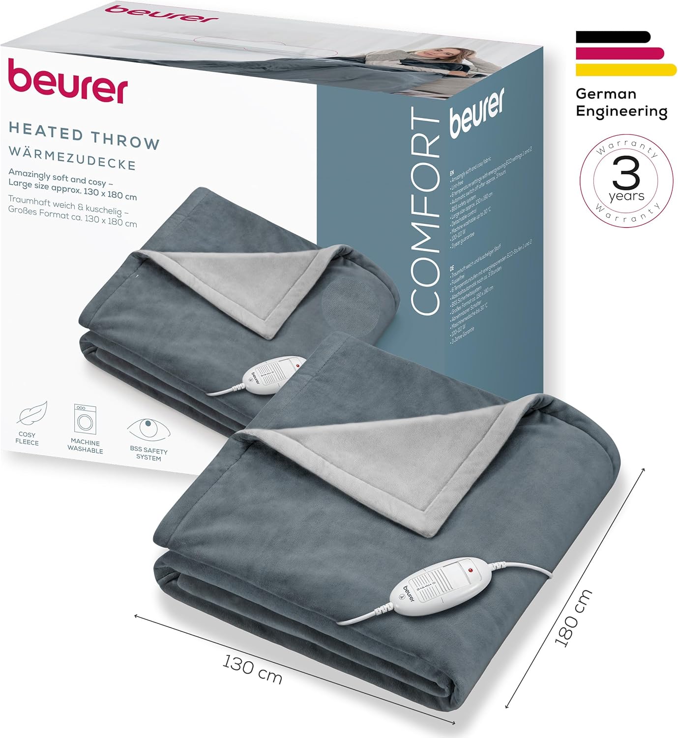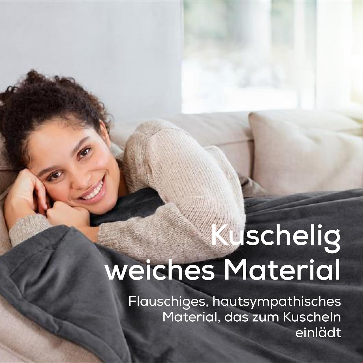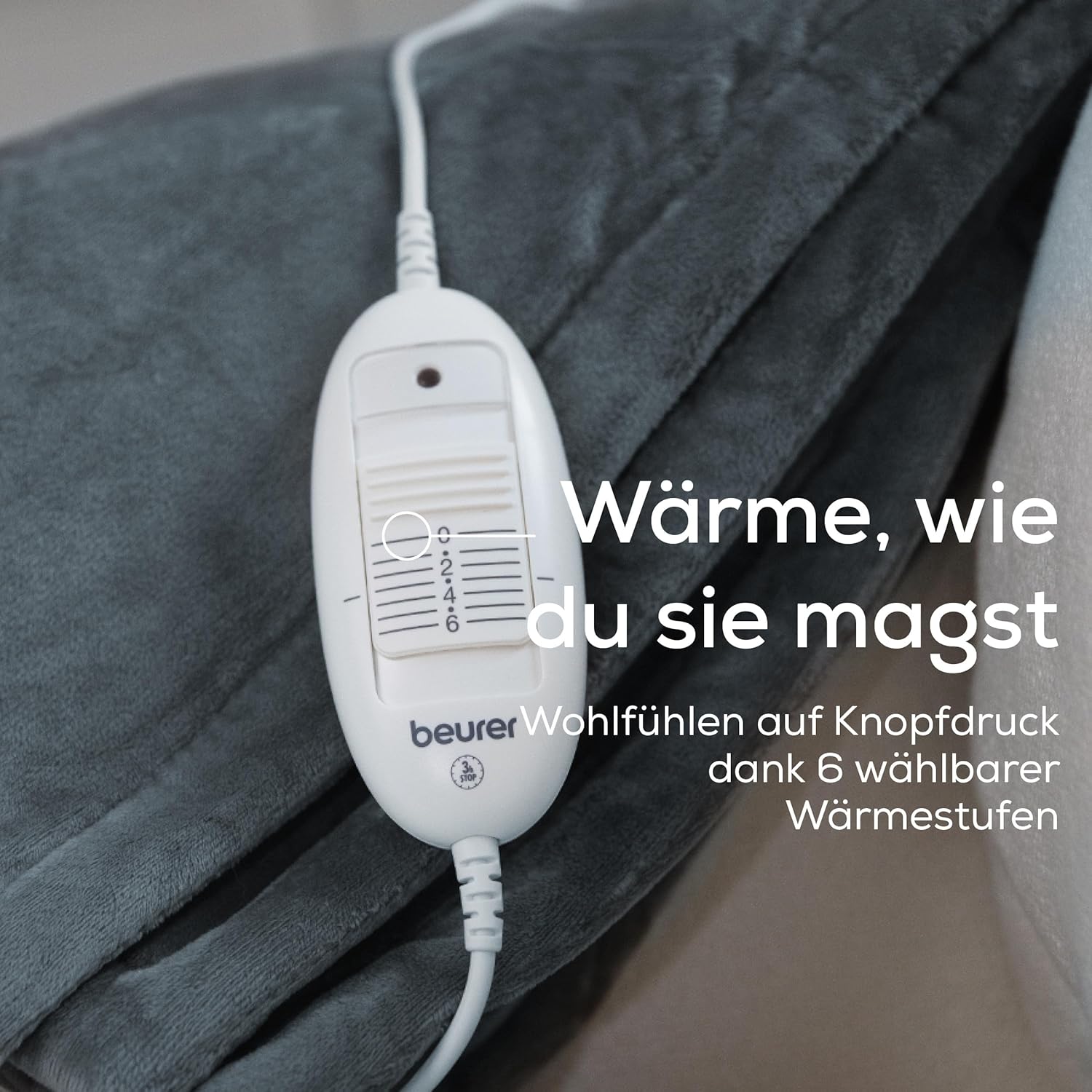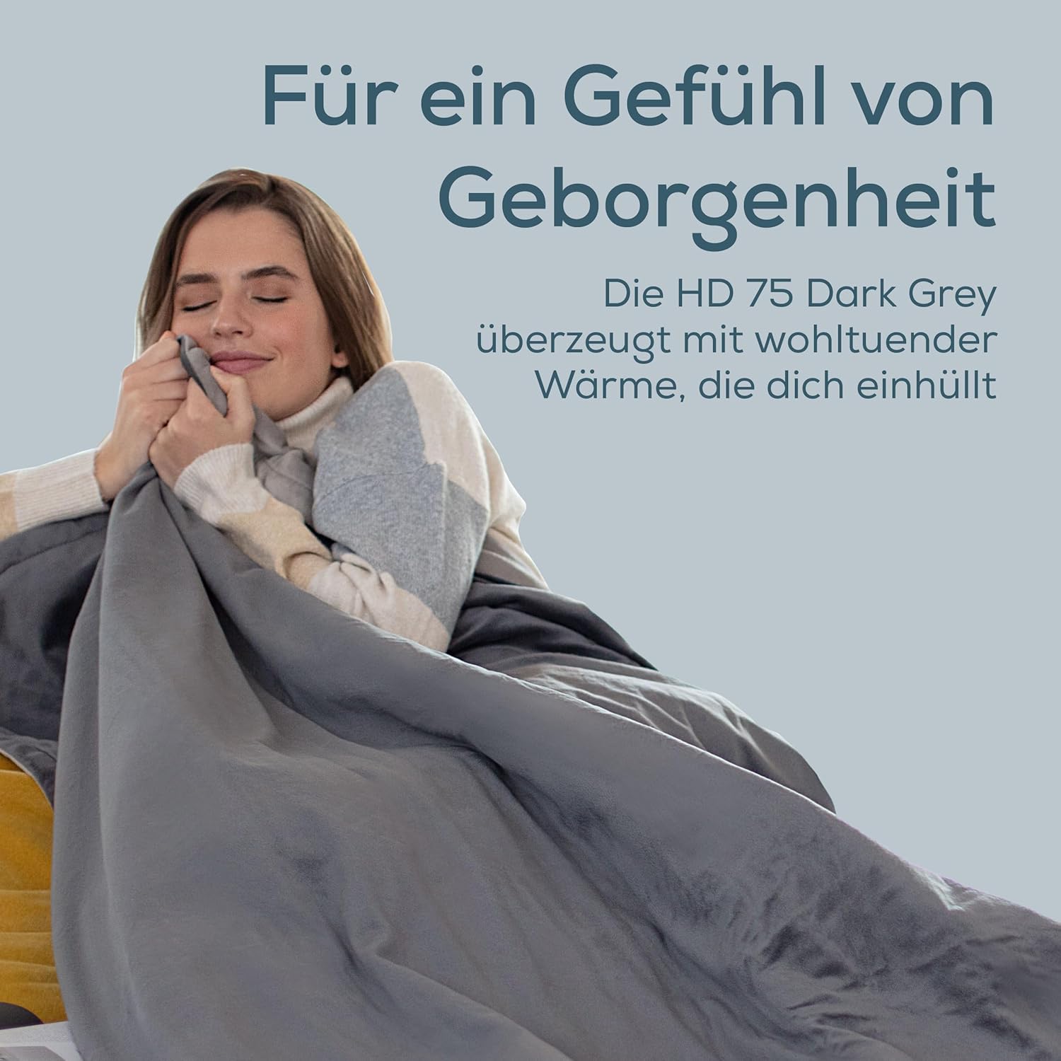 Тъмносивото термо одеяло Beurer HD 75 предлага уютна топлина според вашите лични нужди, благодарение на шестте индивидуално регулируеми температурни настройки. Използвайте затоплящото одеяло като меко, отопляемо одеяло за уютни моменти на дивана или в топлите летни вечери на терасата или балкона. Благодарение на чудесно мекия и пухкав външен материал, самото одеяло е подходящо като меко одеяло за всеки ден, без да използвате функцията за отопление.