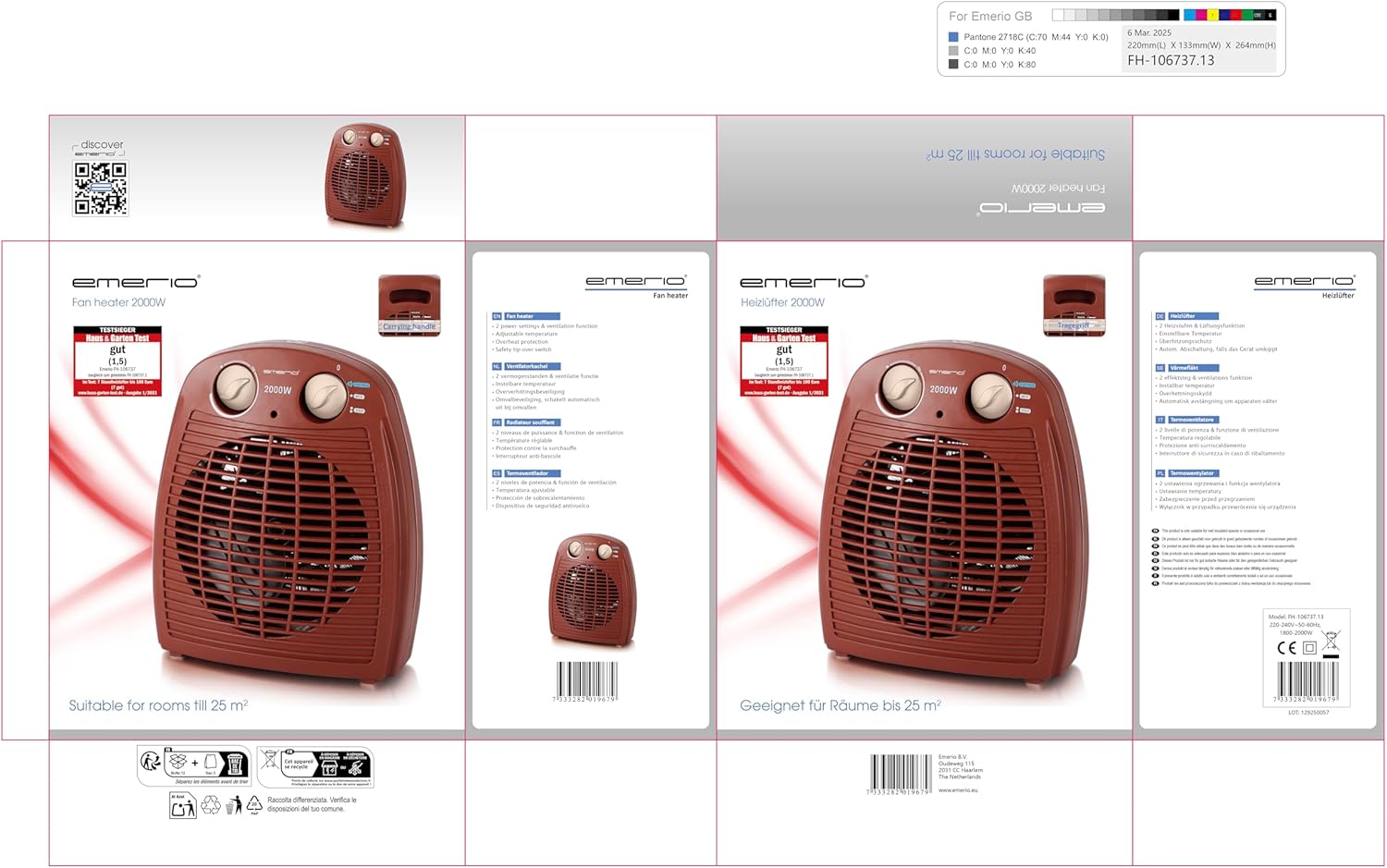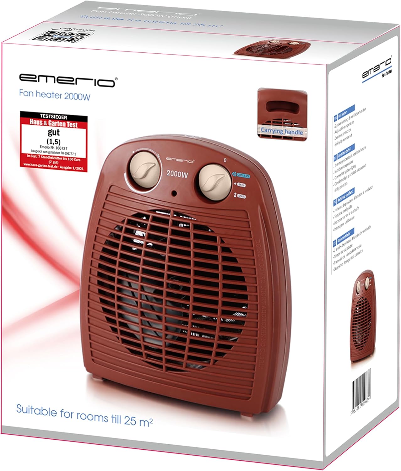 Компактният и мощен вентилаторен отоплител в черно от Emerio има две нива на мощност и е оборудван с термостат. С дръжката за носене, вентилаторният отоплител е лесен за транспортиране и може да се използва гъвкаво в различни помещения. Благодарение на компактния си размер, той е лесен и за съхранение.