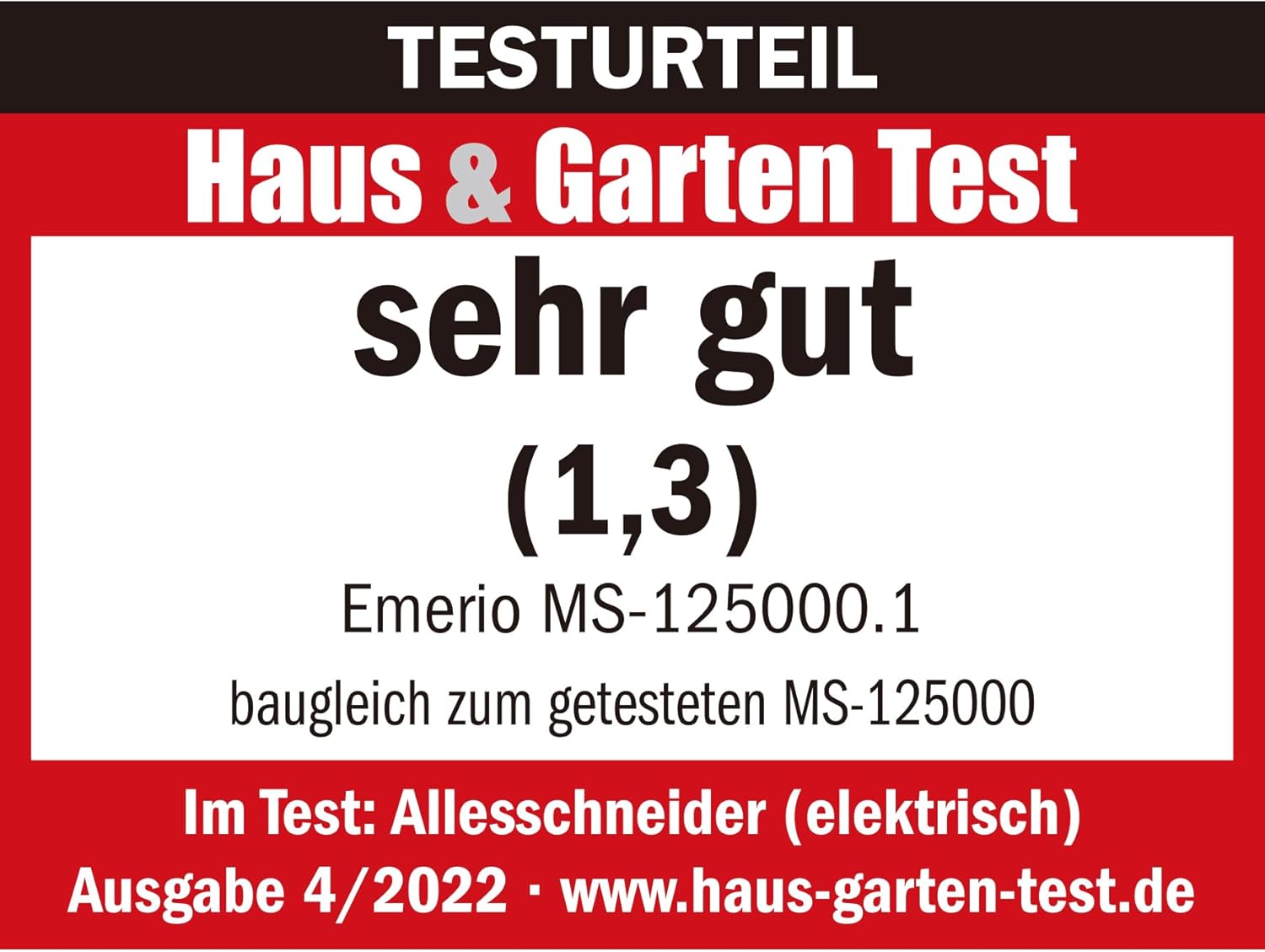 Emerio MS-125000.1 Универсална машина за рязане, произведена в ЕС, ножове от неръждаема стомана, произведени в Германия, регулируеми 0-17 мм, без BPA, спестяващи място, сгъваеми, с предпазен превключвател, еко 100 вата, черна