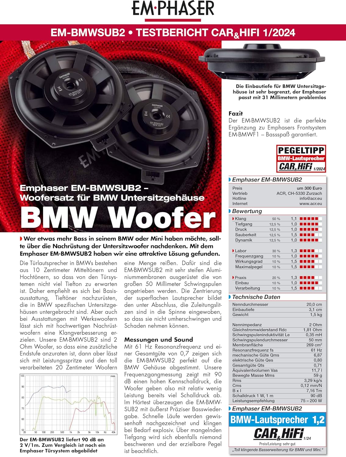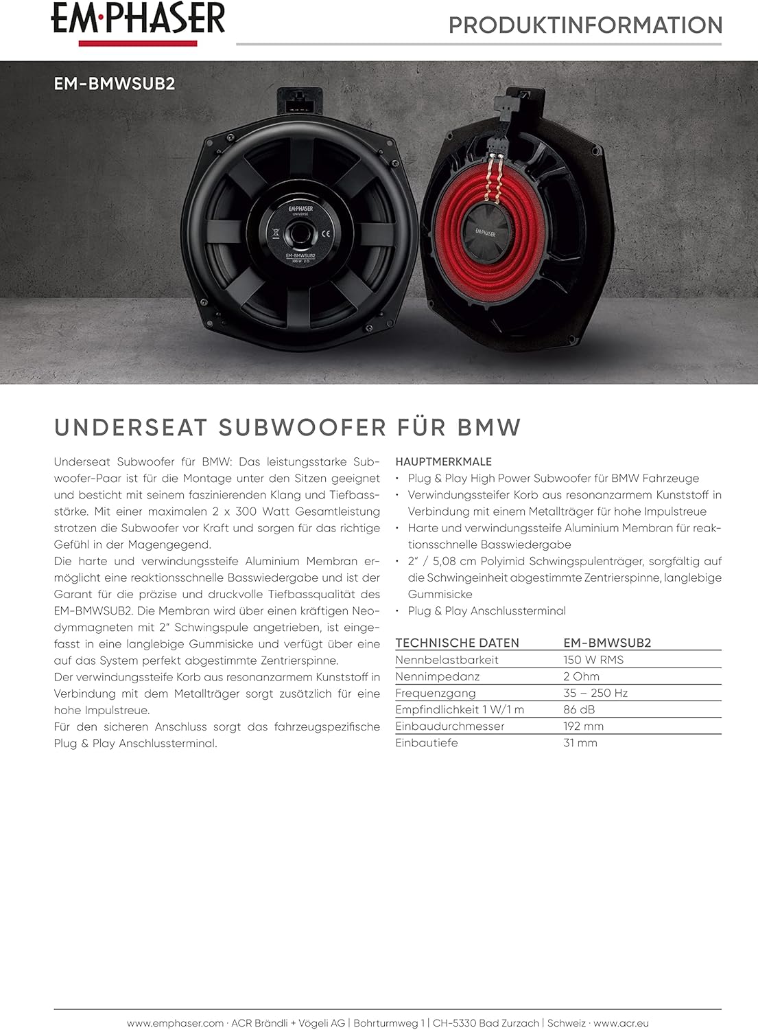 Überragende Qualität, einzigartige Performance – klanglich perfekt aufeinander abgestimmt sind die EMPHASER Systeme für BMW: der Kompo EM-BMWF1 (ASIN B09L4YGZR3), der Koax EM-BMWR1 (ASIN B09L52D4GZ), der Centerspeaker EM-BMWC1 (ASIN B0C6Y6FNNJ) und der Untersitzbass EM-BMWSUB2 (ASIN B0C6Y6FNNJ).