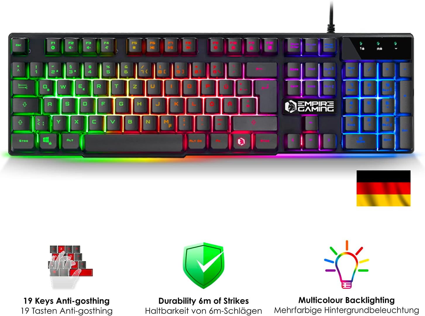 EMPIRE GAMING - Пакет 3 в 1 MK800 - Геймърска клавиатура QWERTZ, немска, RGB, 105 клавиша, 19 клавиша с Anti-Ghosting подсветка - Ергономична RGB геймърска мишка, 2400 DPI подложка за мишка за PC, PS4, PS5, Xbox One/Series, Mac
