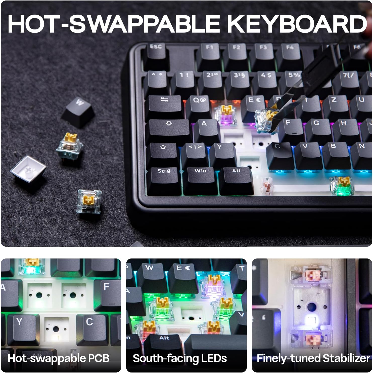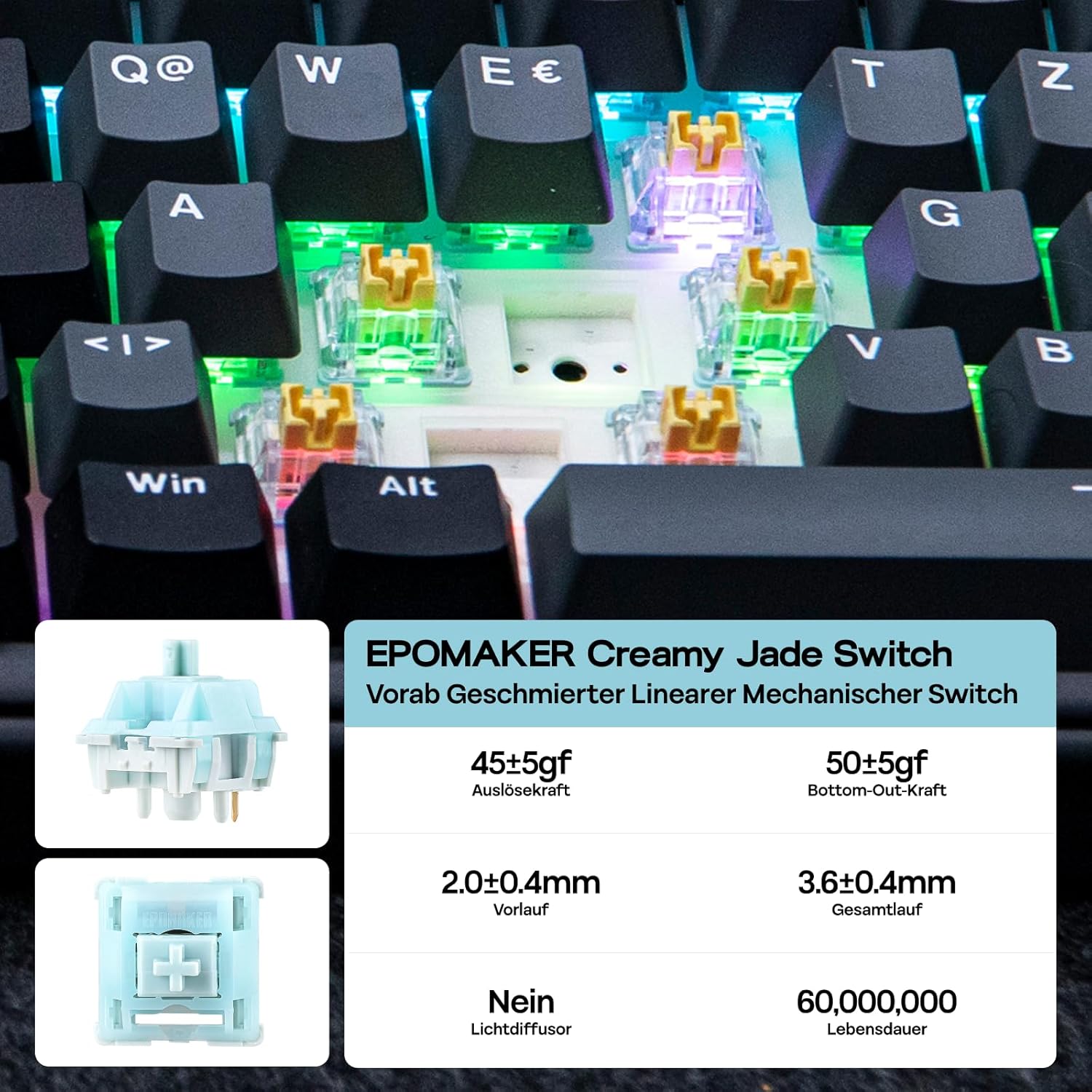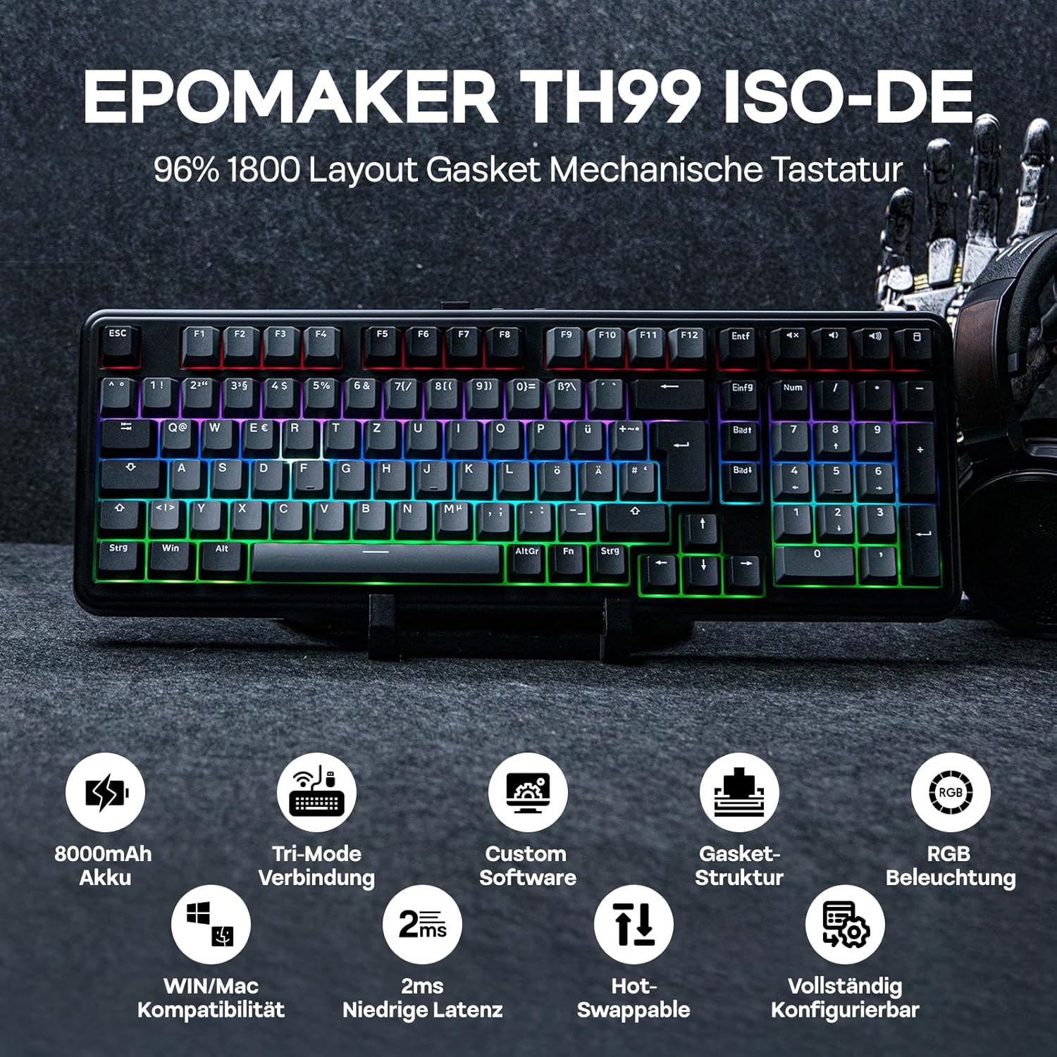 EPOMAKER TH99-ISO-DE QWERTZ Механична клавиатура Безжична, 96% поддръжка на геймъри с цифров блок, гореща замяна, RGB, уплътнение, BT/2.4G/USB-C, софтуер за програмиране (черна, кремаво-нефритена линейна)
