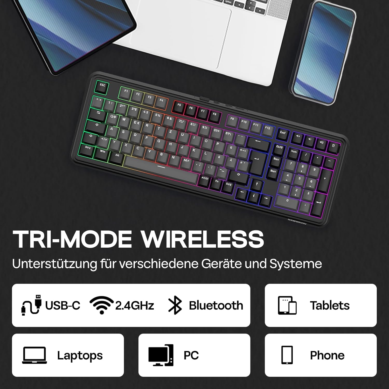 • Безжична трирежимна клавиатура с междусистемна функционалност и разширена батерия от 8000 mAh: захранвана от масивна батерия от 8000 mAh, която издържа 160 часа, когато подсветката е изключена, два пъти по-голям капацитет от предишните модели, безжичната немска клавиатура TH99 работи при първокласни условия чрез компютър, таблет, телефон и гейминг контролер с латентност от само 2-11 ms. С кабел и 2.4G режим. Насладете се на безжичното удобство на Bluetooth 5.0 и 2.4 GHz връзка и се насладете на интуитивния превключвател, който превключва между Mac и Win режим с едно натискане.