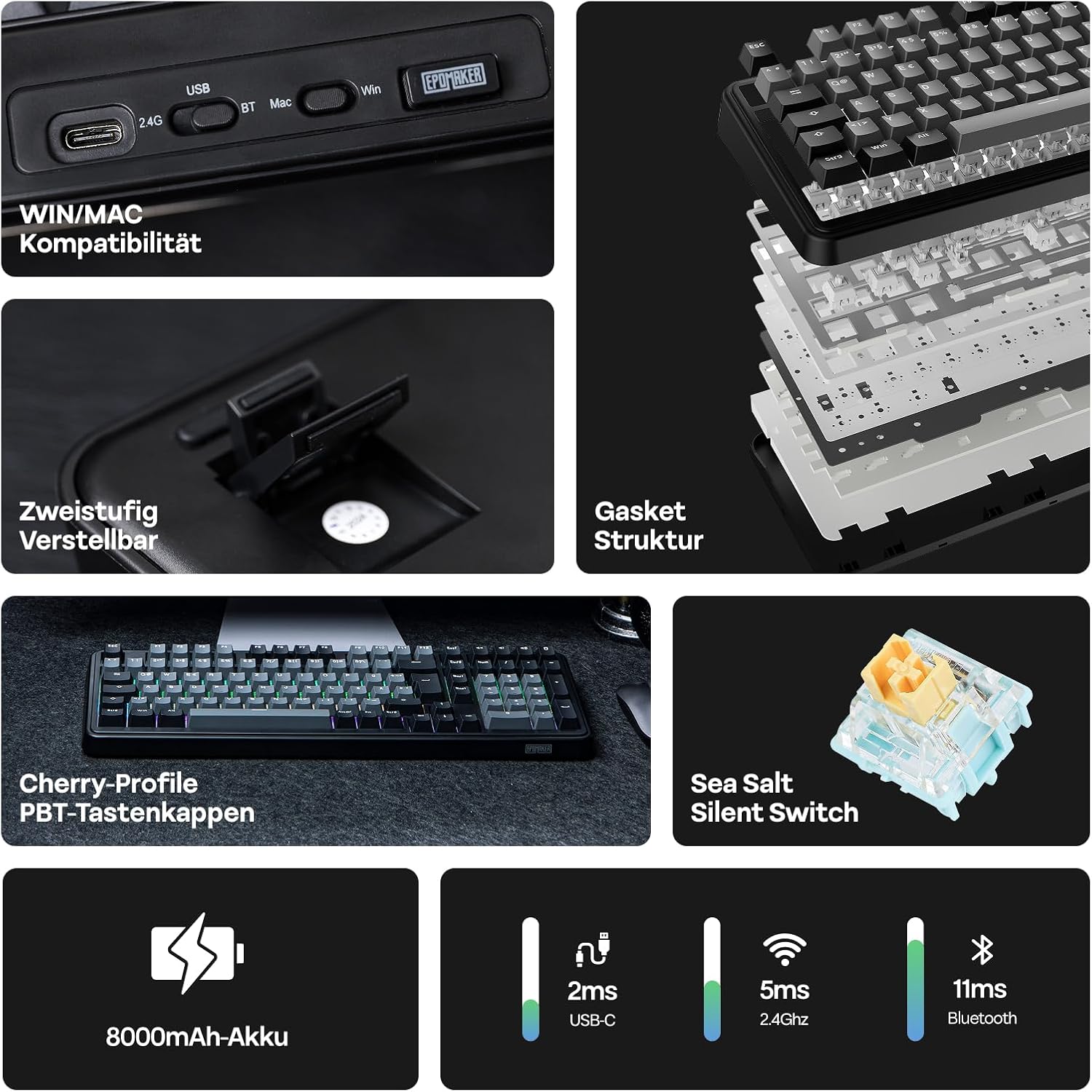 EPOMAKER TH99-ISO-DE QWERTZ Механична клавиатура Безжична, 96% поддръжка на геймъри с цифров блок, гореща замяна, RGB, уплътнение, BT/2.4G/USB-C, софтуер за програмиране (черна, морска сол Silent V2)