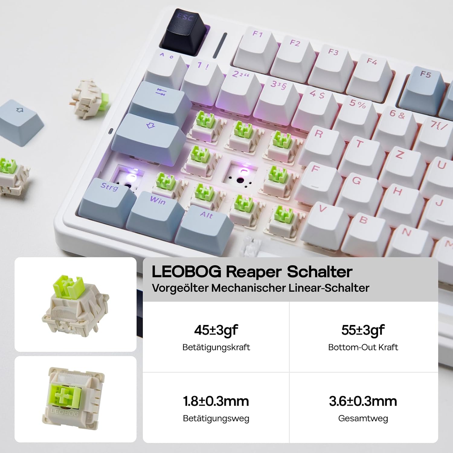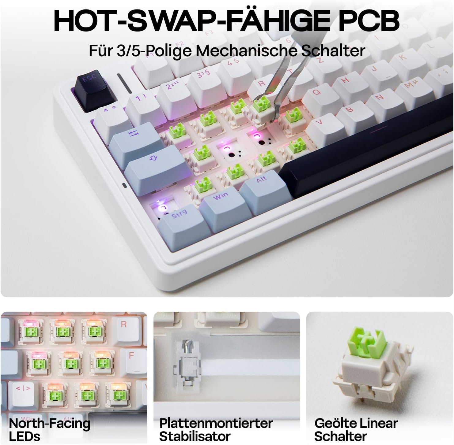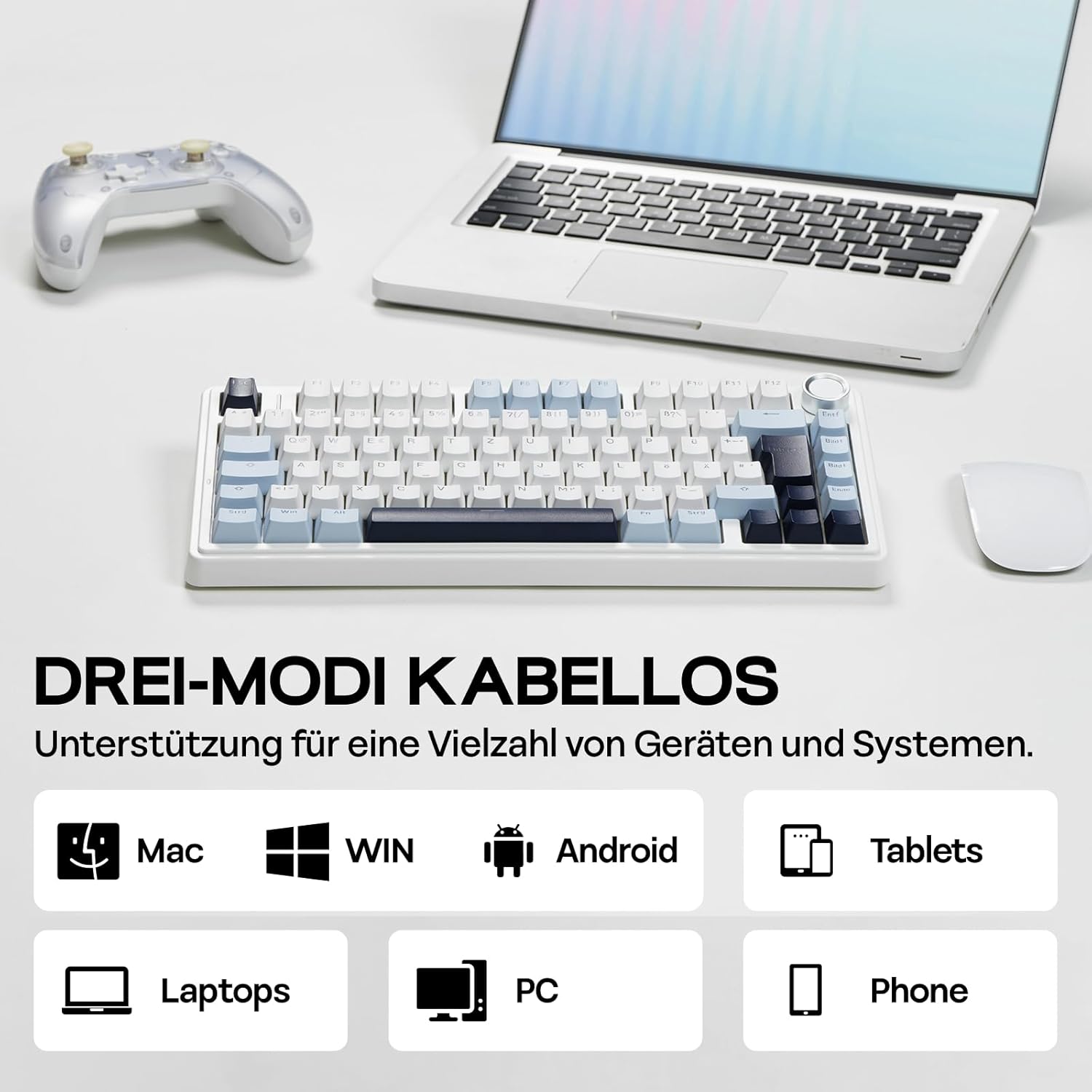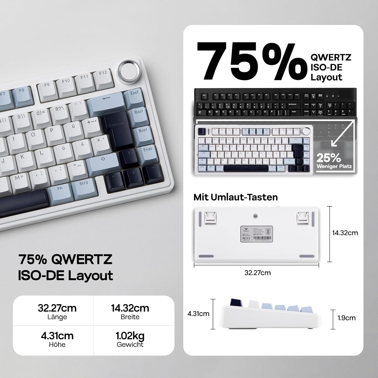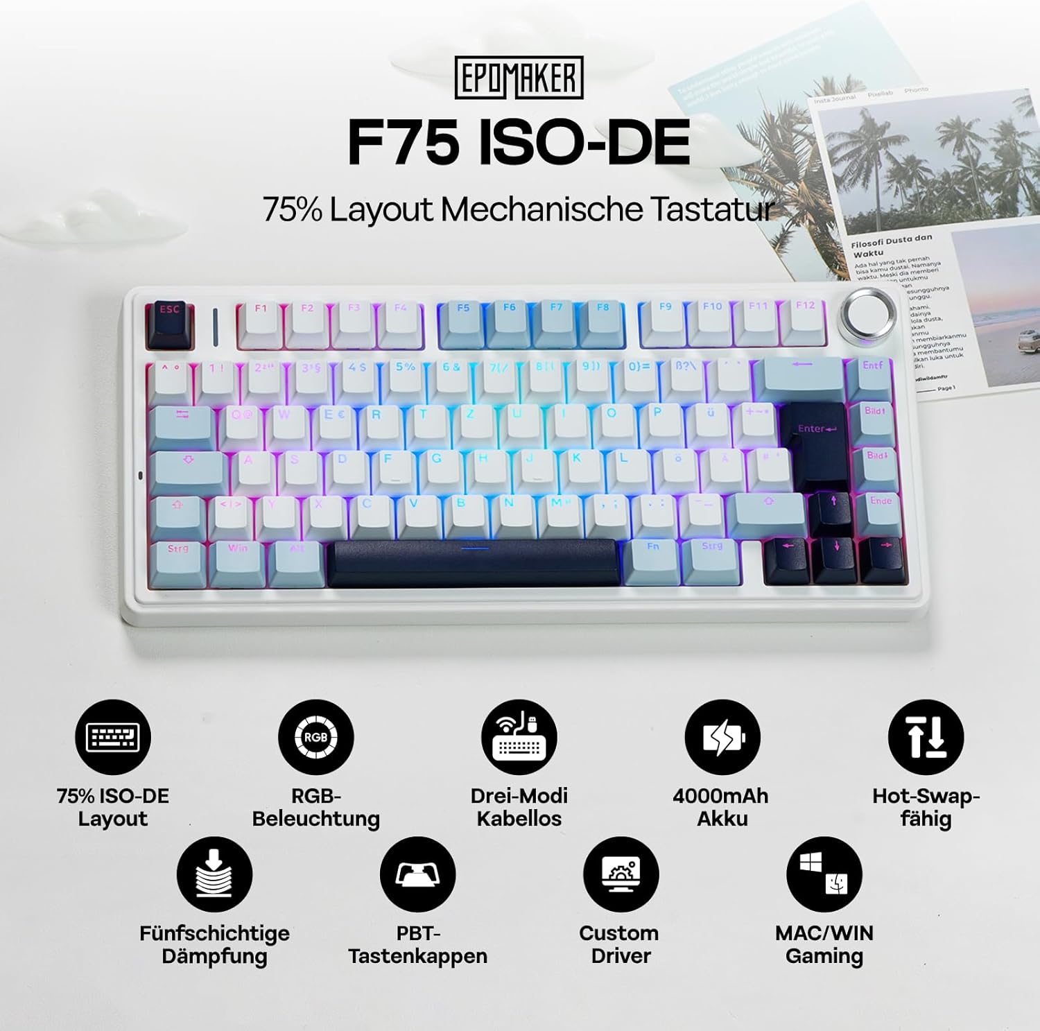EPOMAKER x Aula F75-ISO Механична клавиатура Безжична, Hot Swap Геймърска клавиатура 75% процента, Clear Layout QWERTZ, Bluetooth/Безжична/USB-C, Бутони и RGB (Светлосиньо, LEOBOG Reaper Switch)