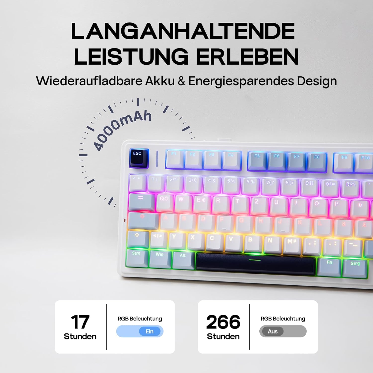 • Extremely responsive, low latency & vivid 16.8M RGB lighting: immerse yourself in the dynamic glow of RGB lighting of the F75 ISO, which offers a rich spectrum of 16.8 million colours for a personalized typing environment. Adjust the lighting patterns to your preferences and create a desktop atmosphere that adapts to your mood. Thanks to the extremely responsive, low-latency connection, the F75 ISO ensures that every key press is not only vividly illuminated, but also transmitted quickly and precisely, whether you're playing or typing