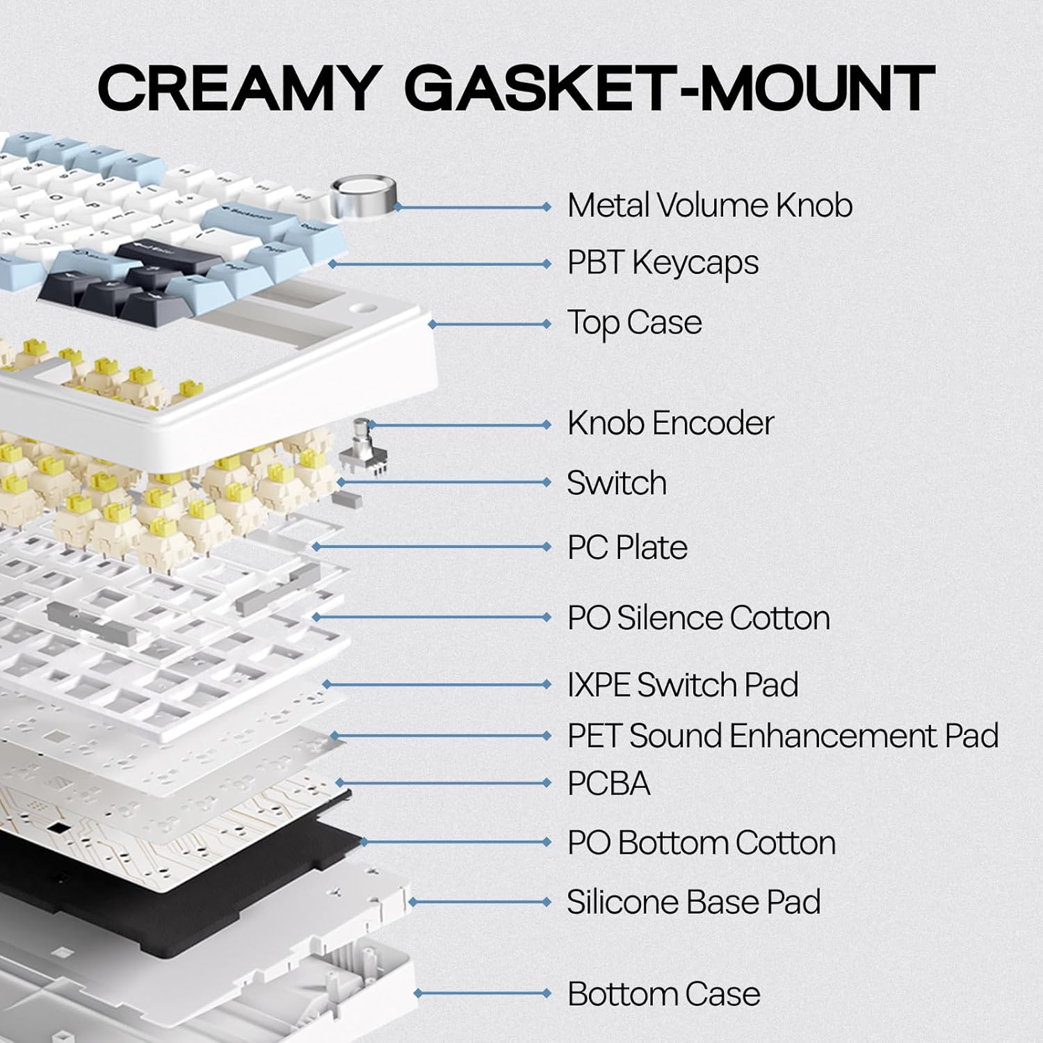 • АКУСТИЧНО ВИСОКОКАЧЕСТВЕНО ПРОИЗВОДИТЕЛСТВО С ПЕТСЛОЙНА ПОДЛОЖКА F75-ISO разполага с петслоен шумопоглъщащ и ударопоглъщащ вътрешен дизайн, включващ два слоя порен пяна, IXPE подложка за превключватели, PET подложка за усилване на звука и долна силиконова подложка. Тази гениална конструкция значително намалява шума и резонанса при писане, осигурявайки тиха и фокусирана среда за писане.