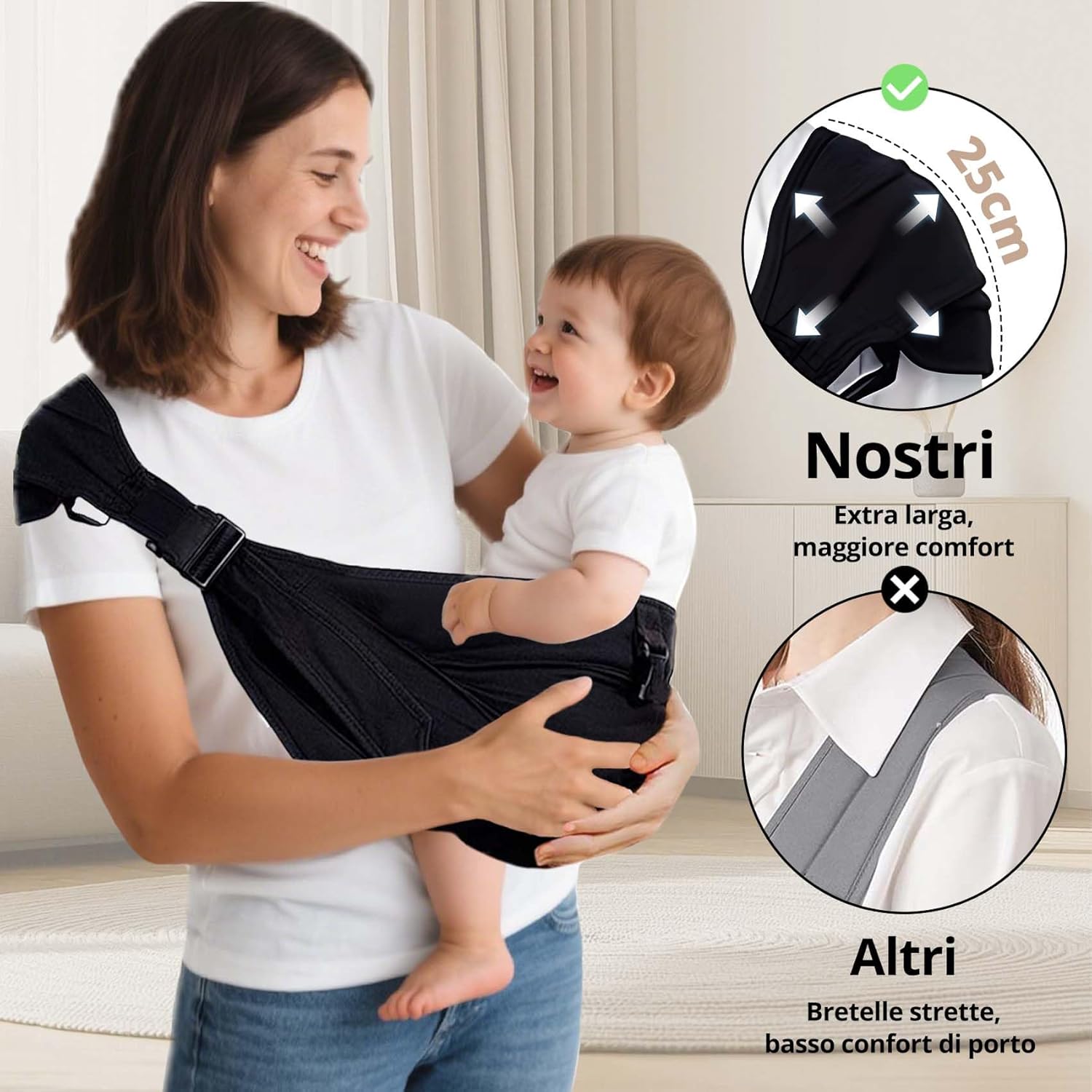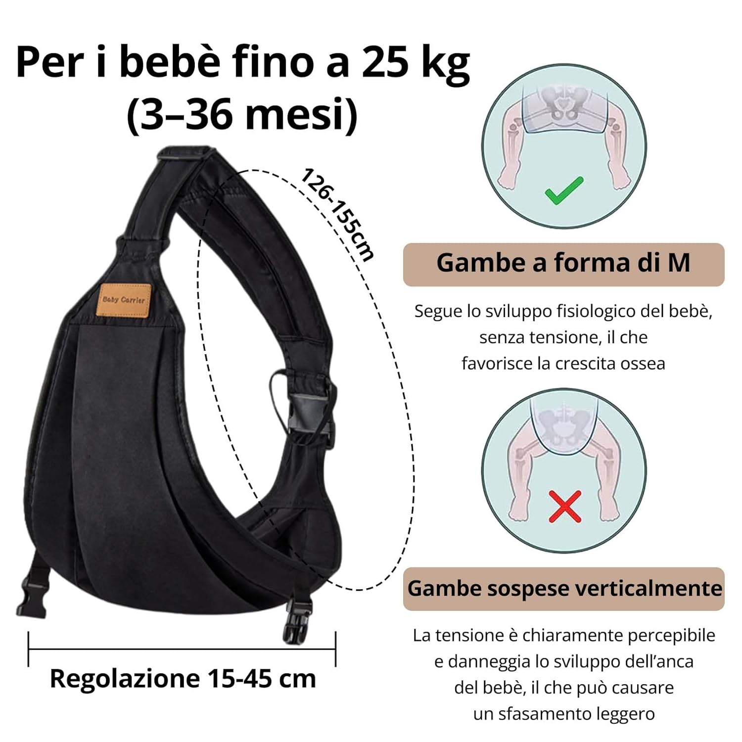 • Ергономичен дизайн за бебето и носещия: Проектиран за продължително носене с изключително широка комфортна презрамка, която разпределя 80% от натиска върху раменете в сравнение с конвенционалните презрамки. Сертифициран по ASTM детски носач за 3-25 кг (0-36 месеца). Обективно, еднораменният носач за бебета се препоръчва за бебета между 3-15 кг, за да се осигури по-висок комфорт. Гарантира, че бебето ви поддържа правилната М-образна стойка на краката. Преминава теста за тазобедрена става и намалява риска от проблеми с развитието.